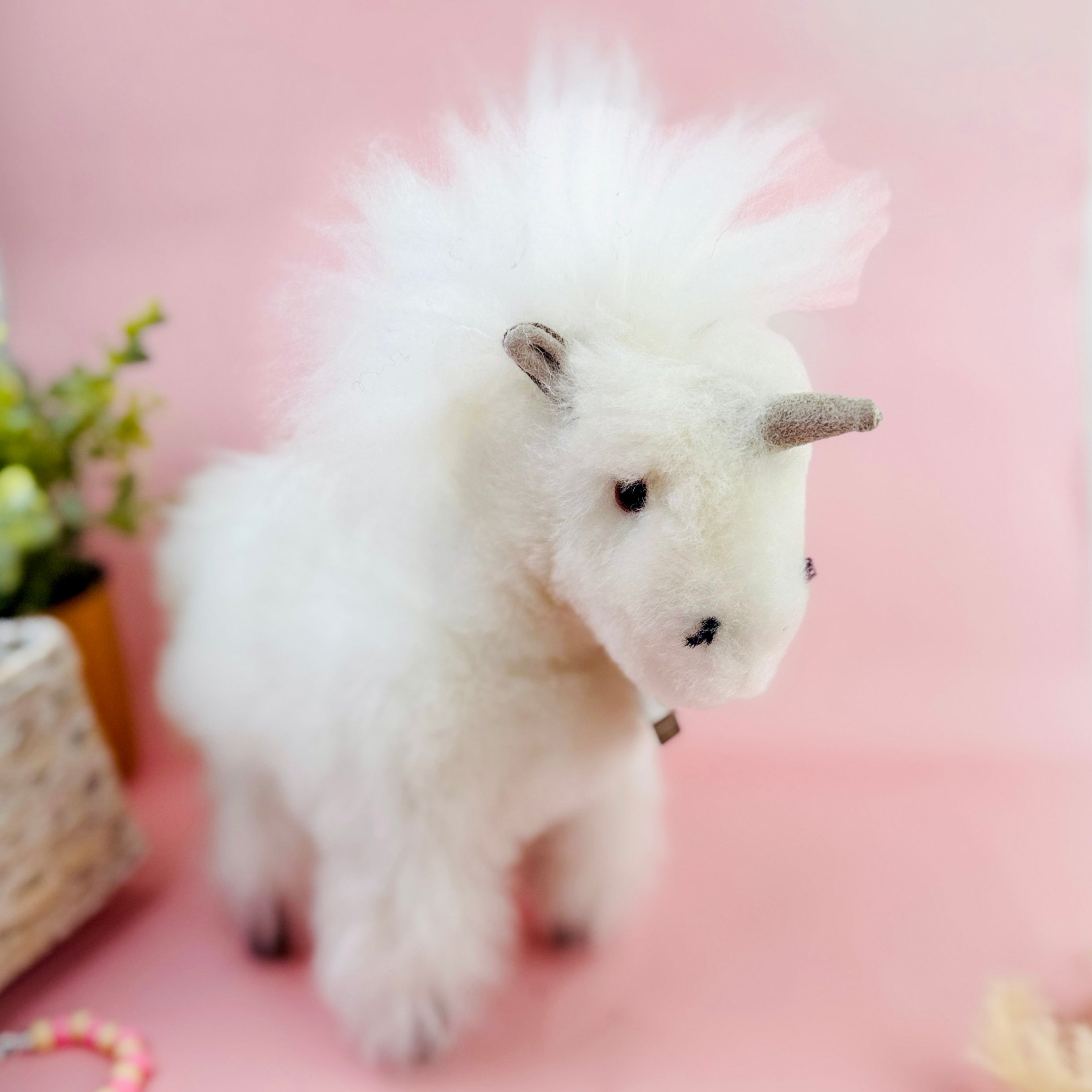 Bring home the magic with our Handmade Alpaca Unicorn, a one-of-a-kind artisan plushie handcrafted in Peru. Made from genuine alpaca fur, this lovable unicorn is sweet and soft for nursery decor or a unique gift for collectors.