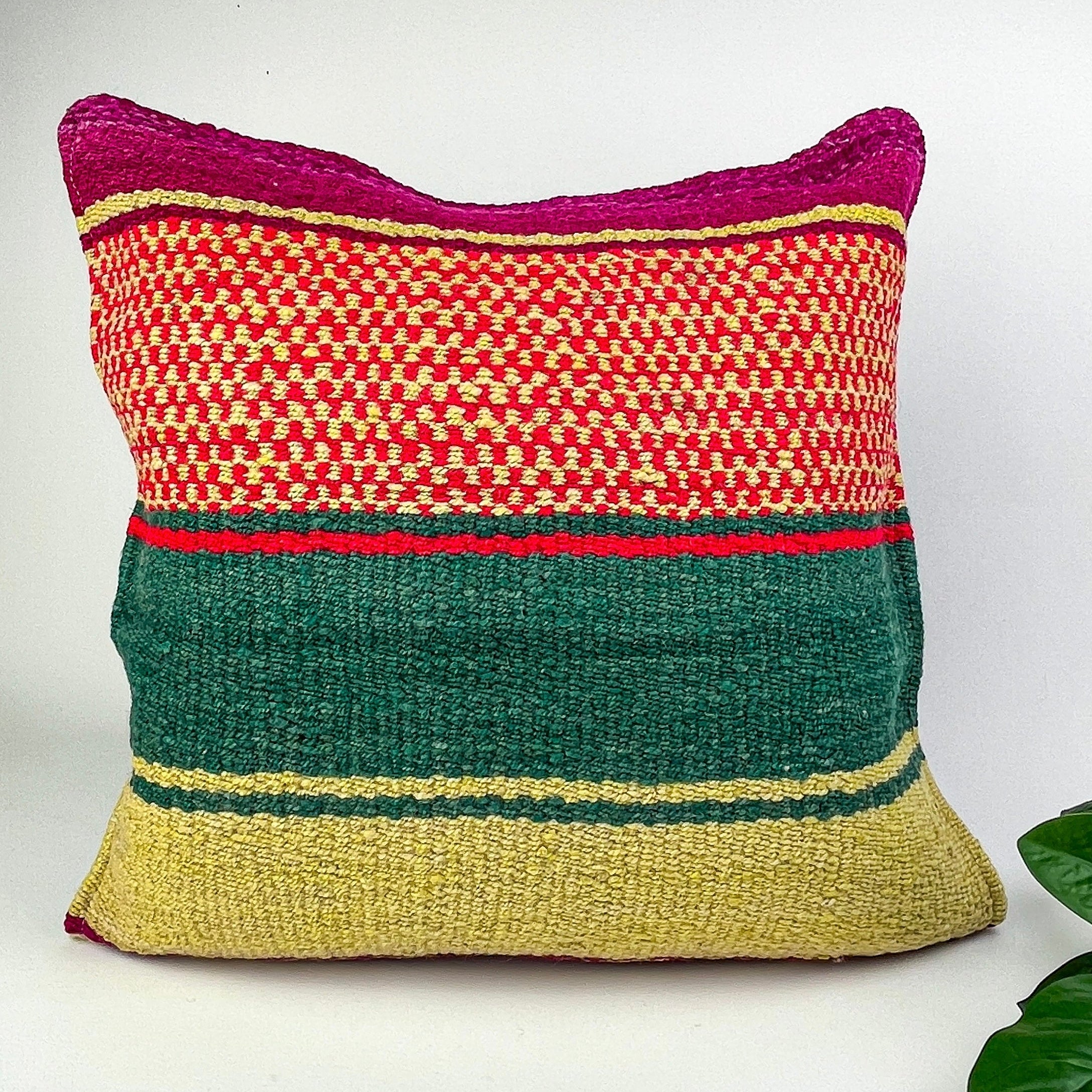 Handwoven Wool Pillow Cover 55 : (18x18) Yellow Green Stripes, Boho Home Decor