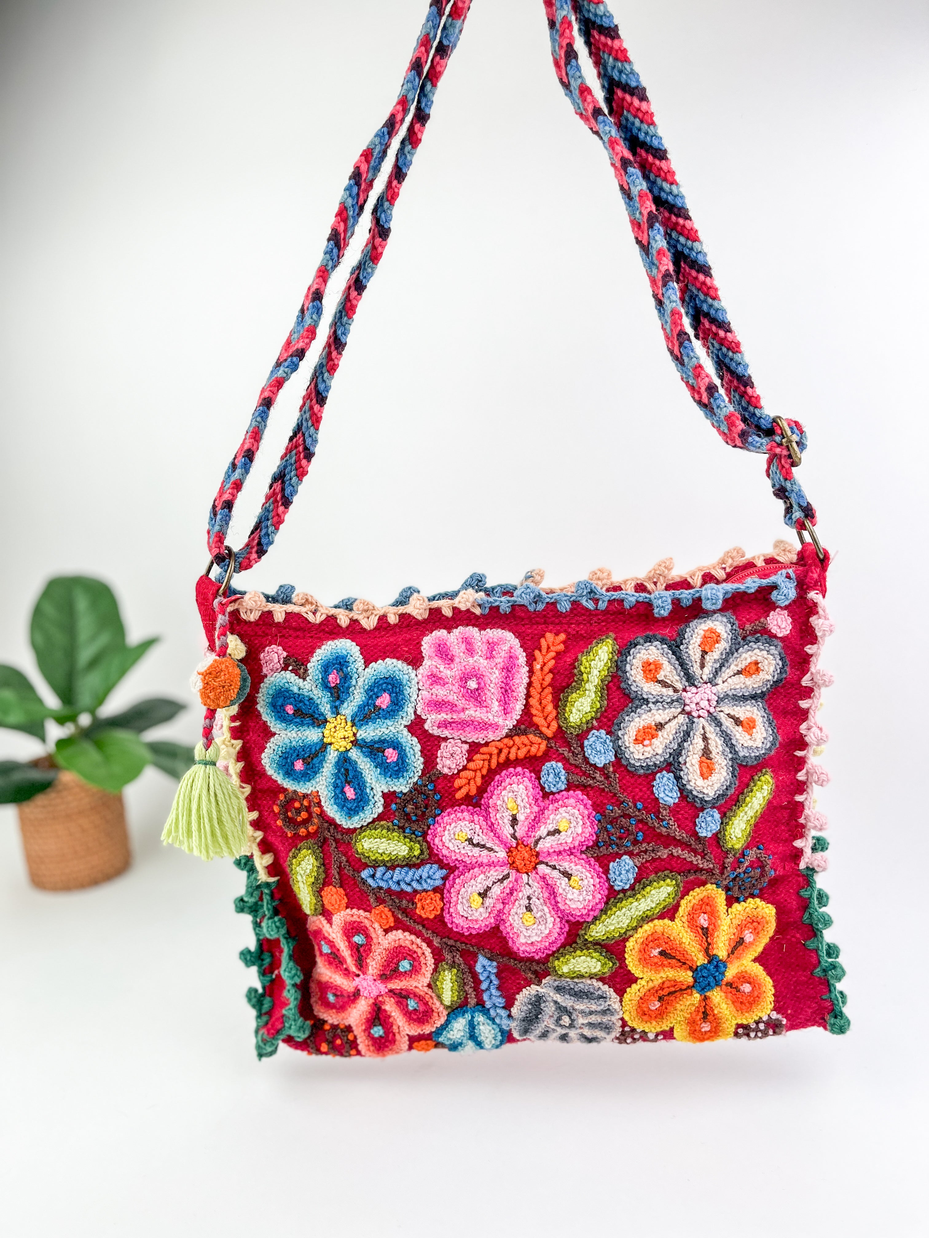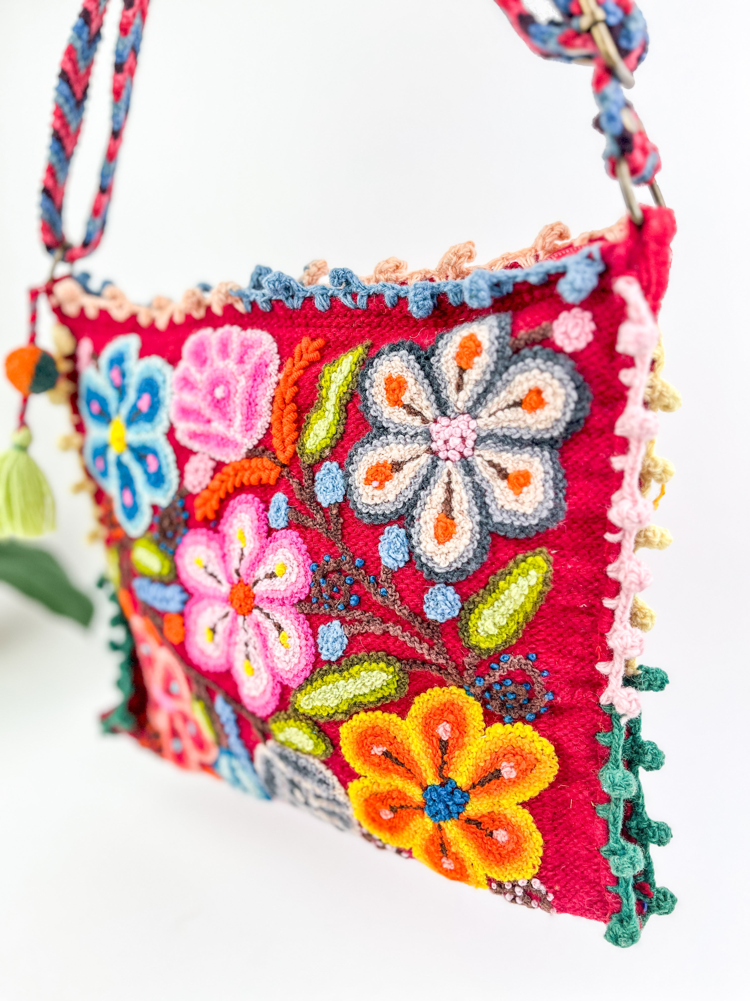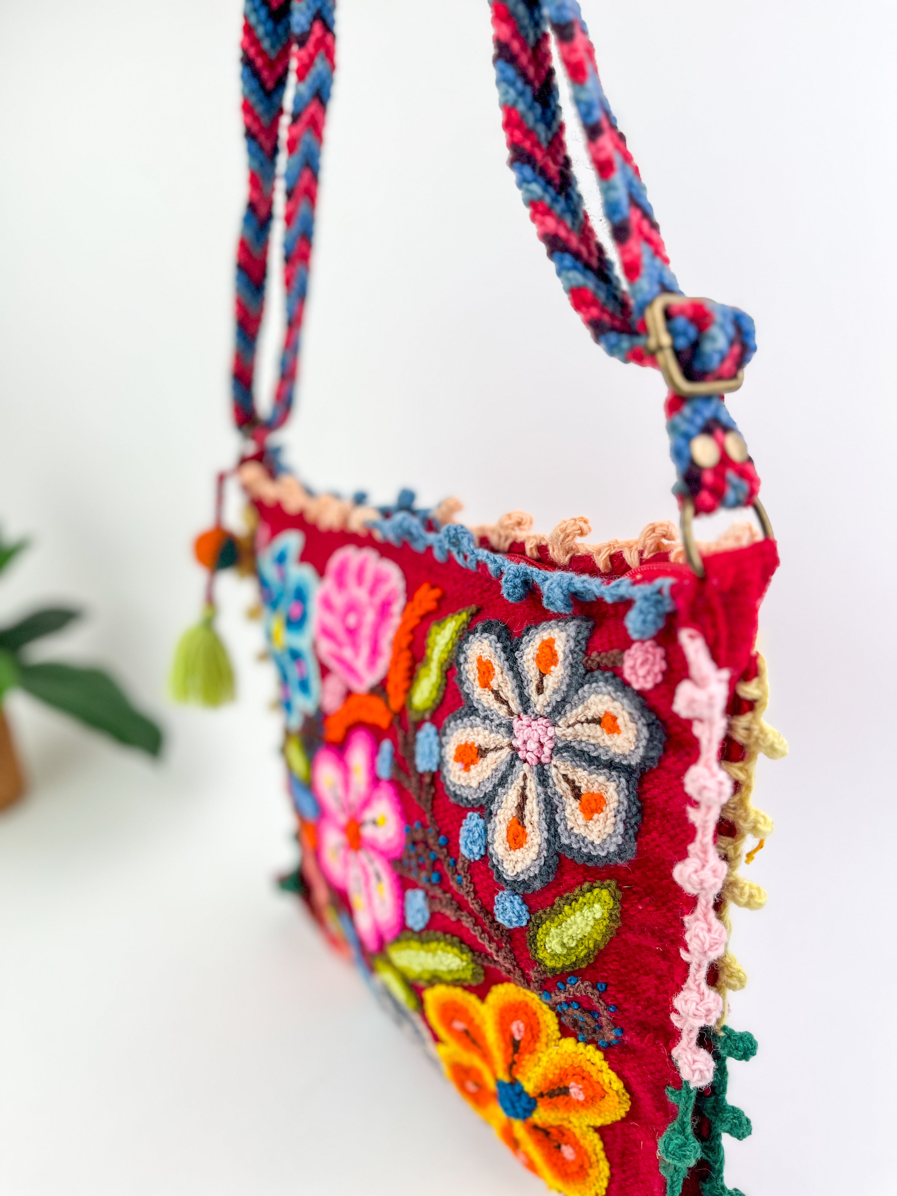 From the hand-loomed wool and alpaca fabric to the joyful florals hand-embroidered in radiant hues, this bag is more than an accessory—it’s wearable art. The adjustable loomed strap and playful pom poms add extra flair, while the fully lined interior keeps things practical with a secure zip pocket.