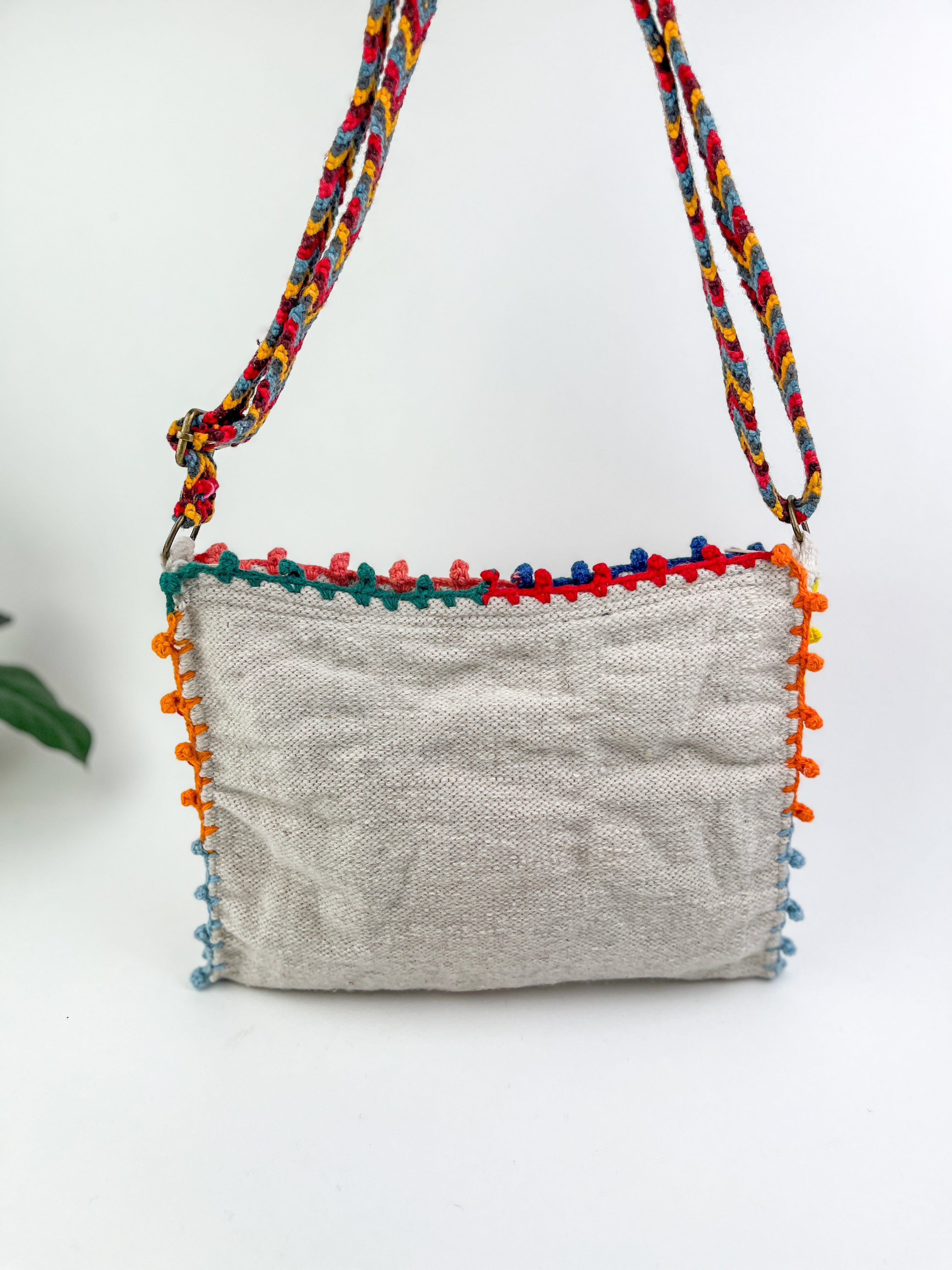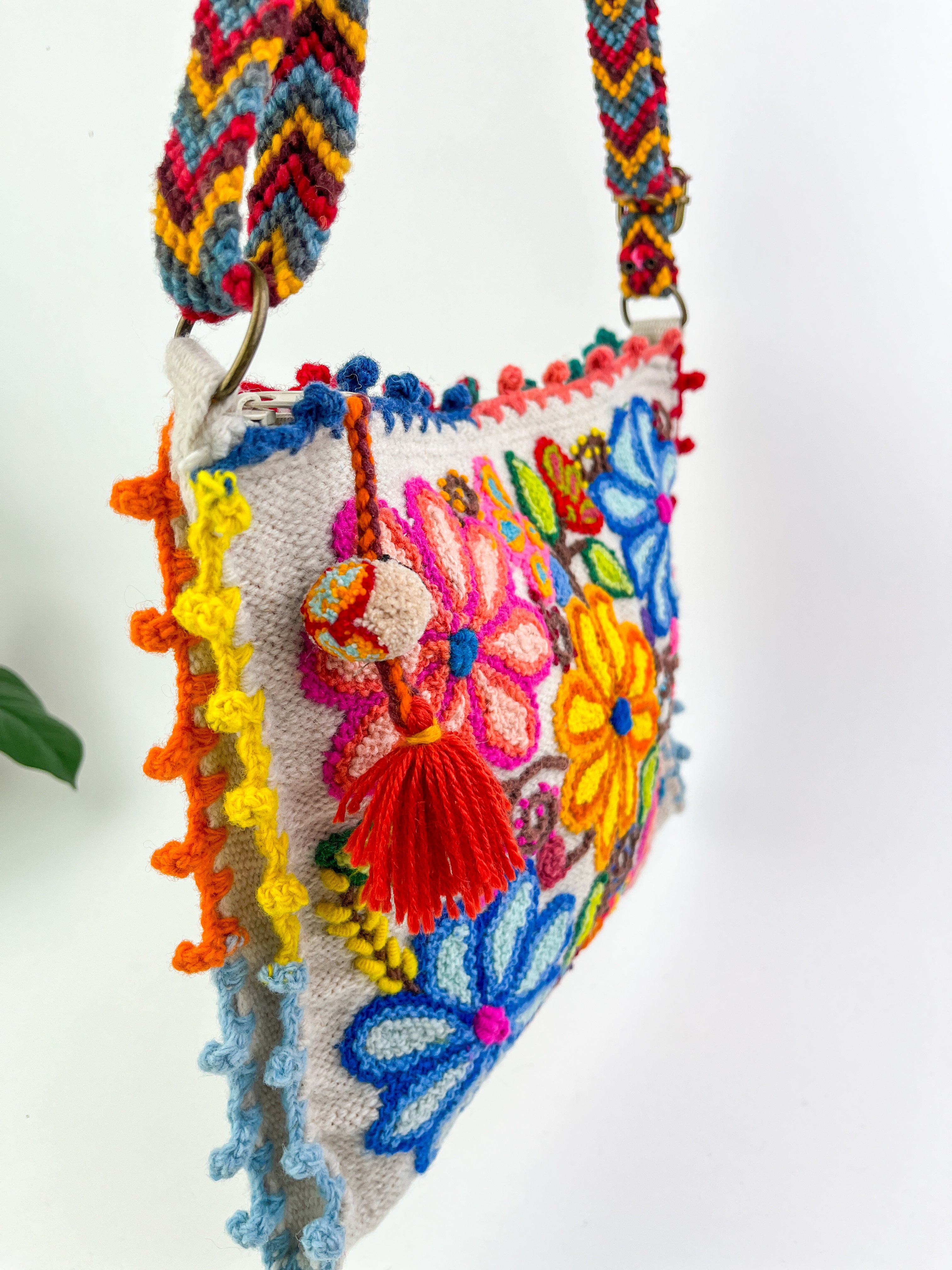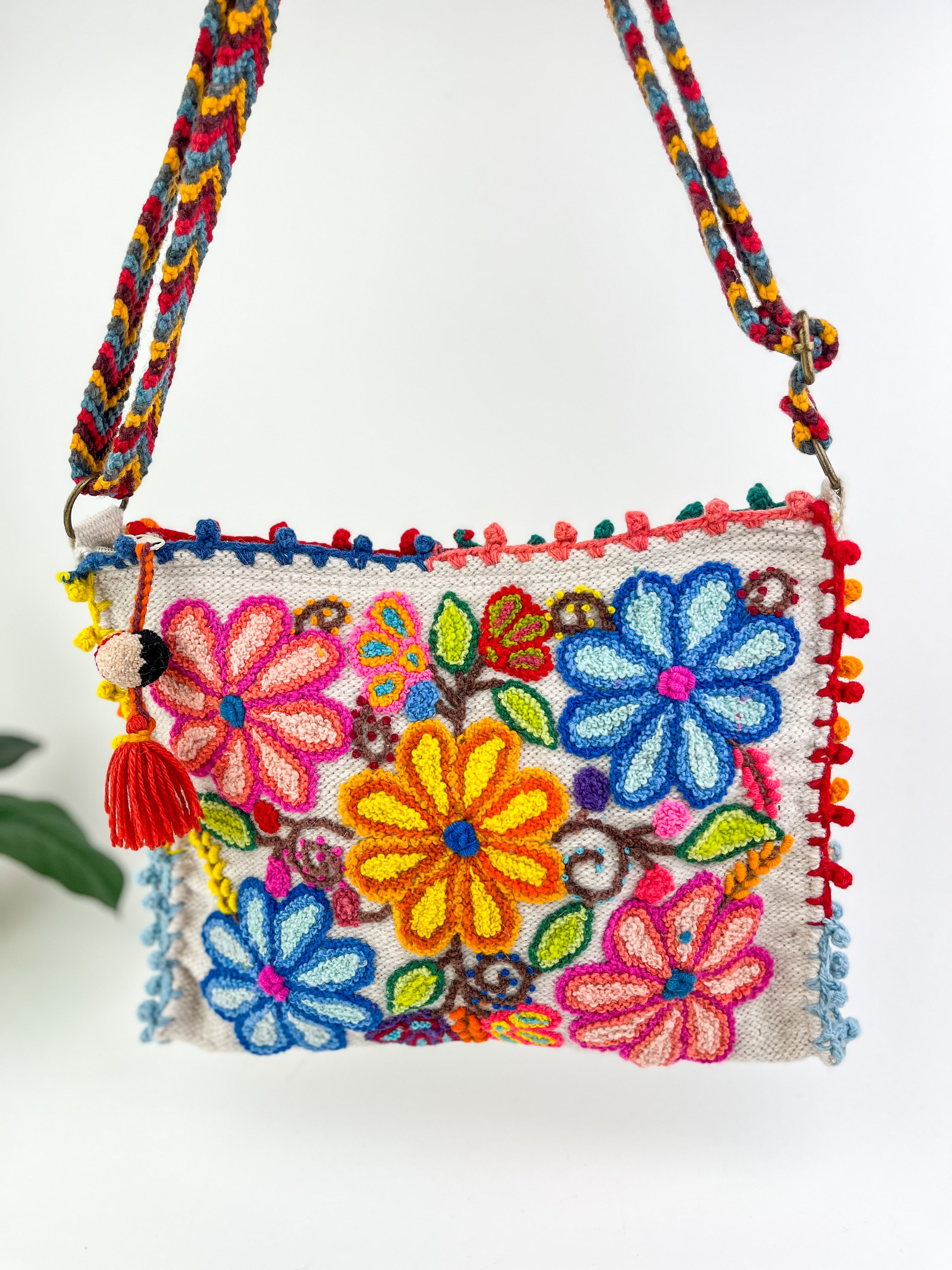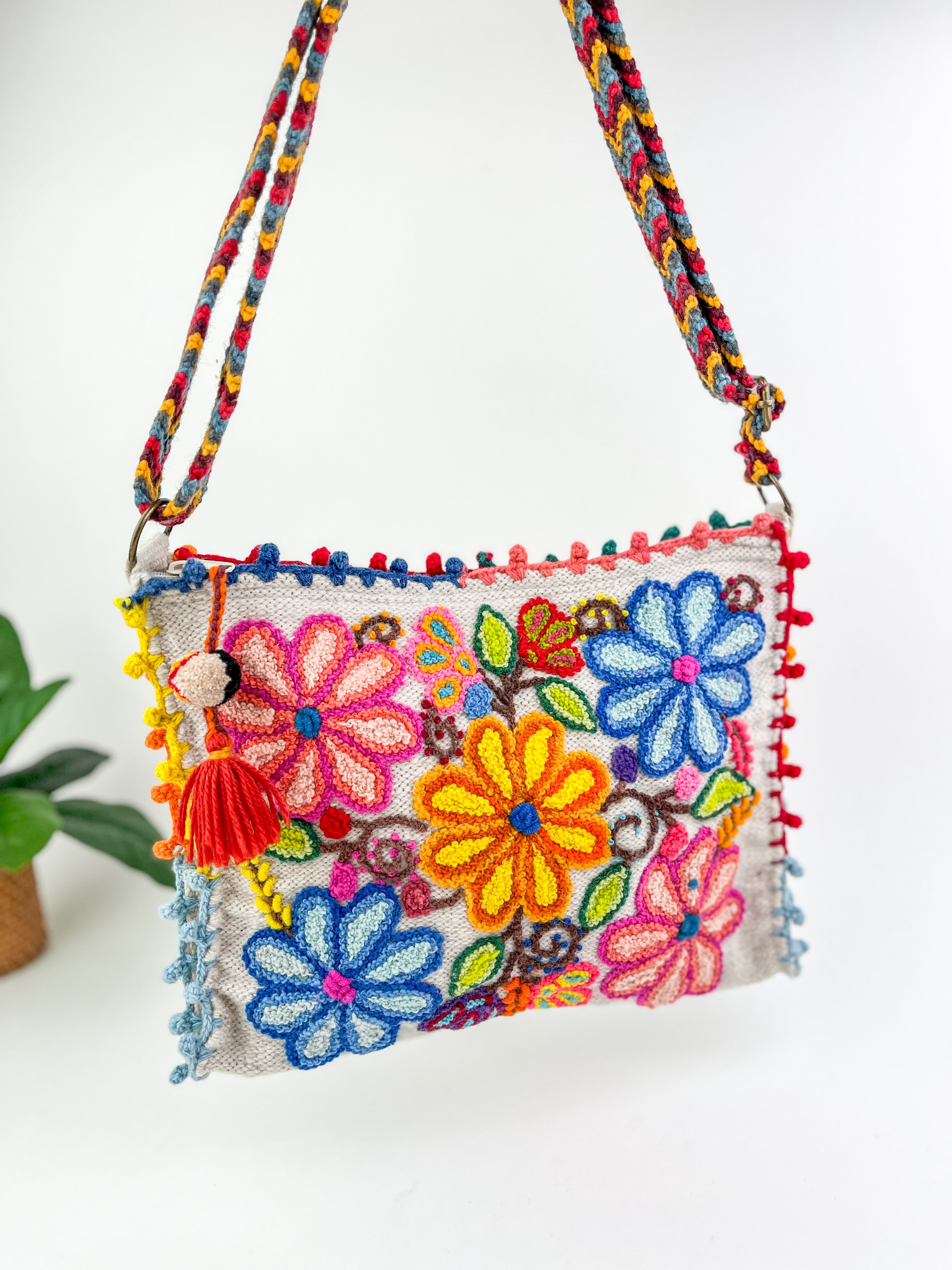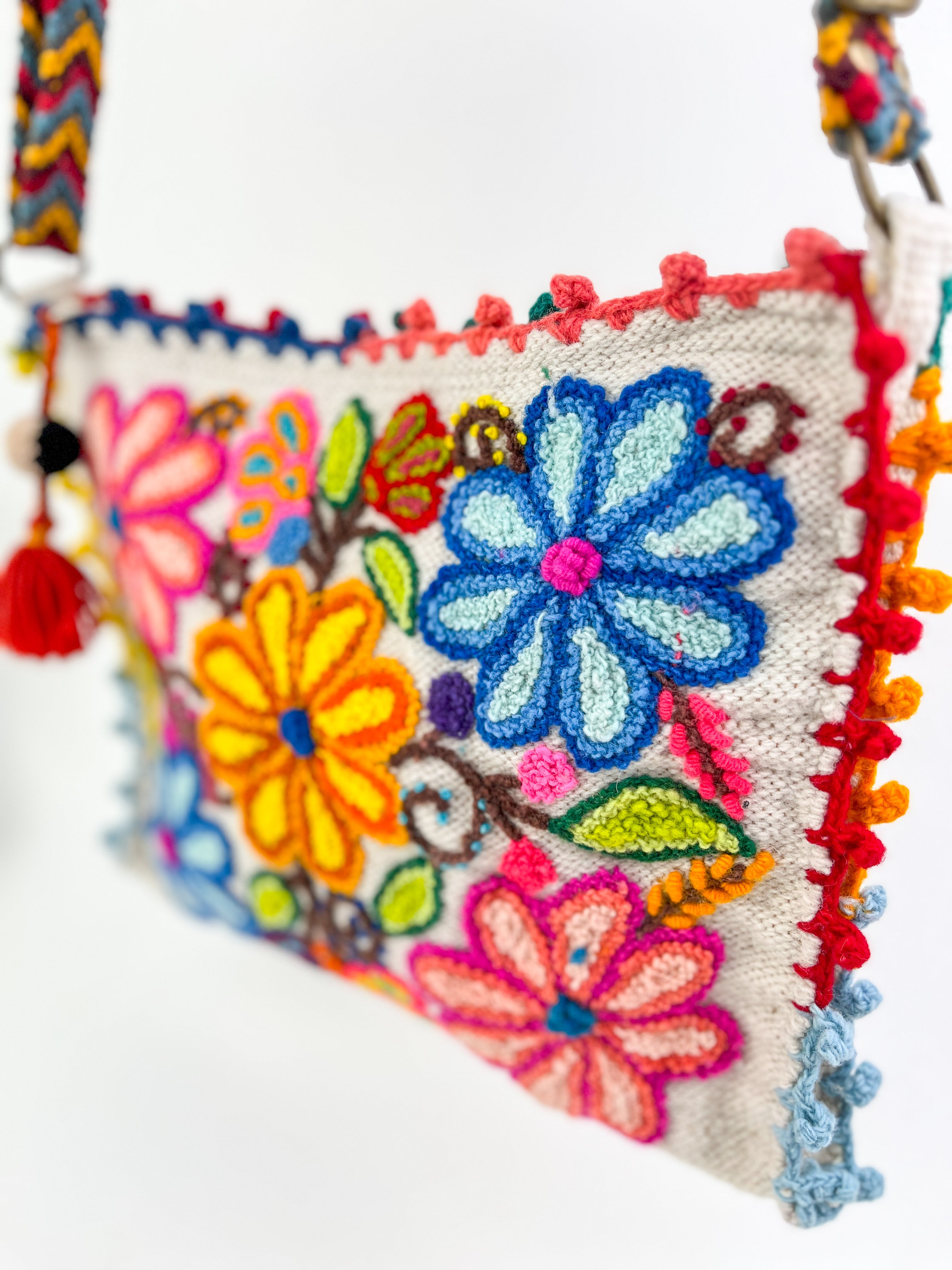 From the hand-loomed wool and alpaca fabric to the joyful florals hand-embroidered in radiant hues, this bag is more than an accessory—it’s wearable art. The adjustable loomed strap and playful pom poms add extra flair, while the fully lined interior keeps things practical with a secure zip pocket.