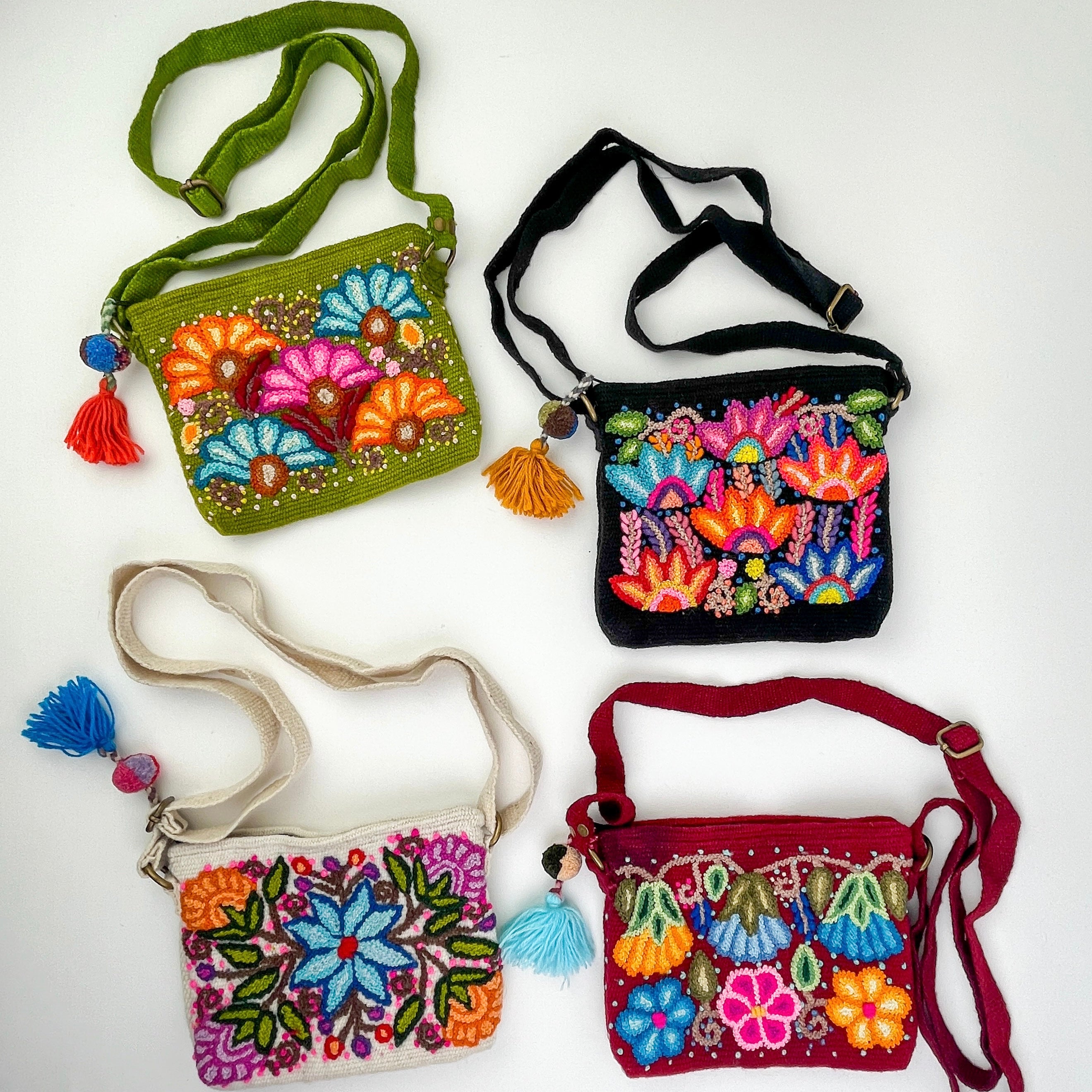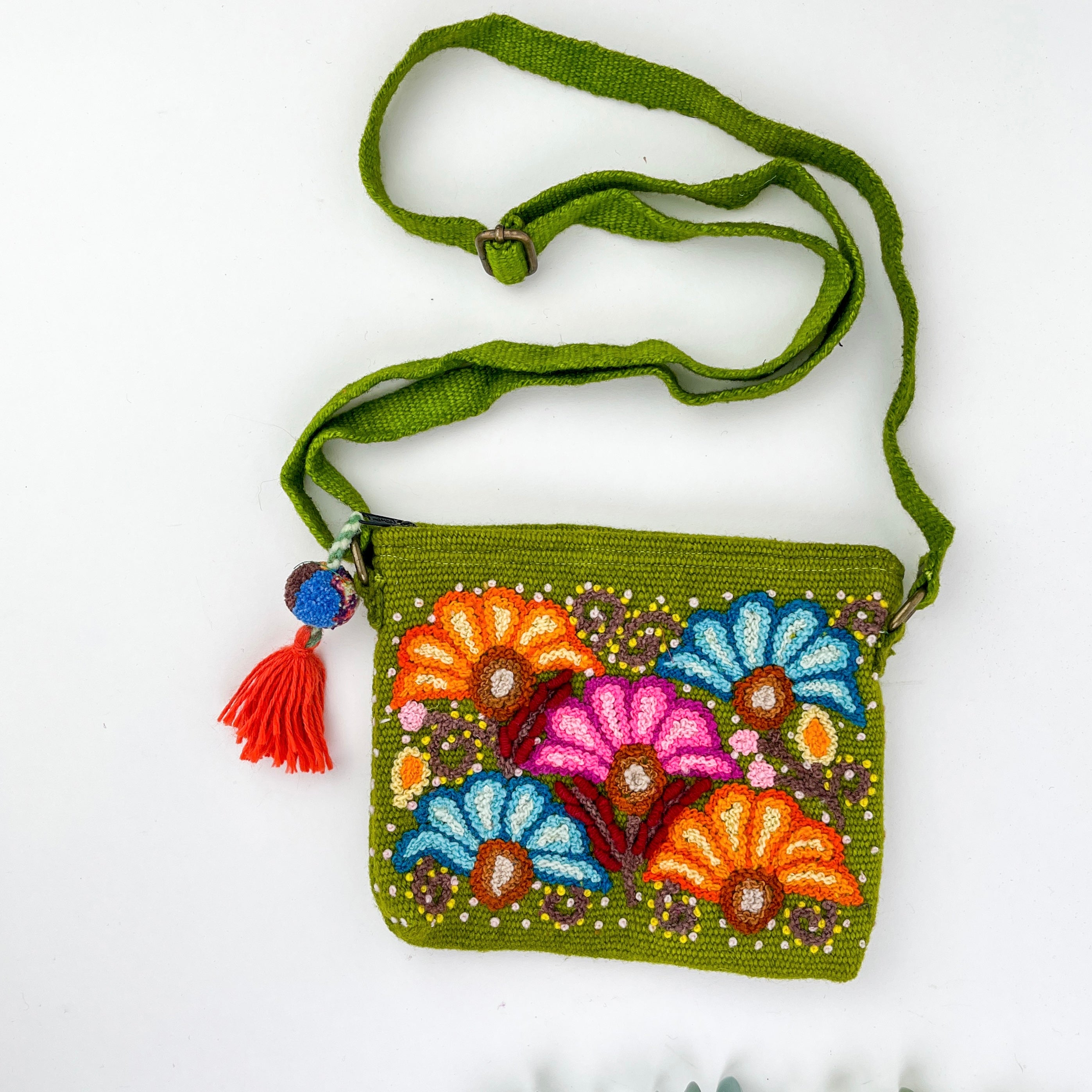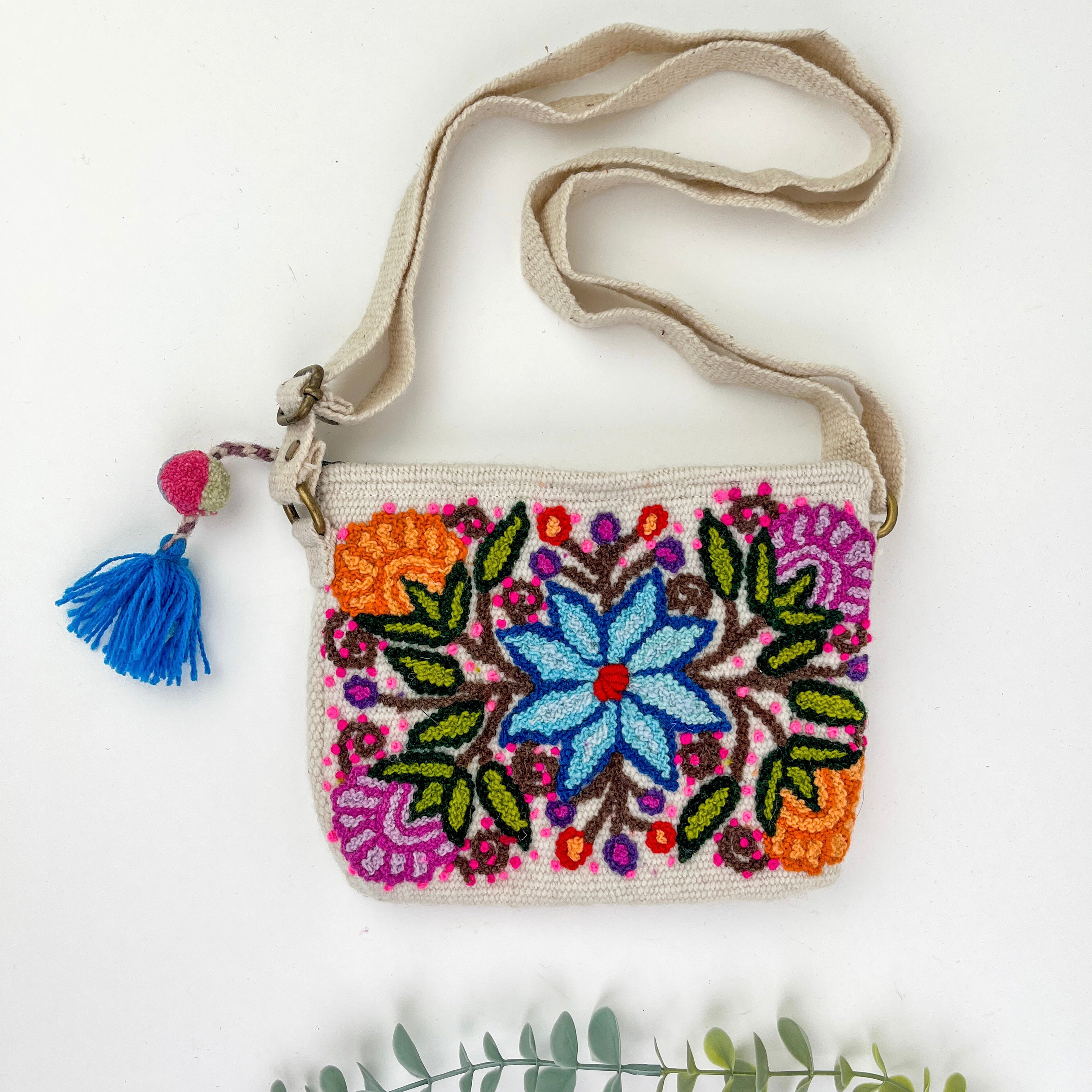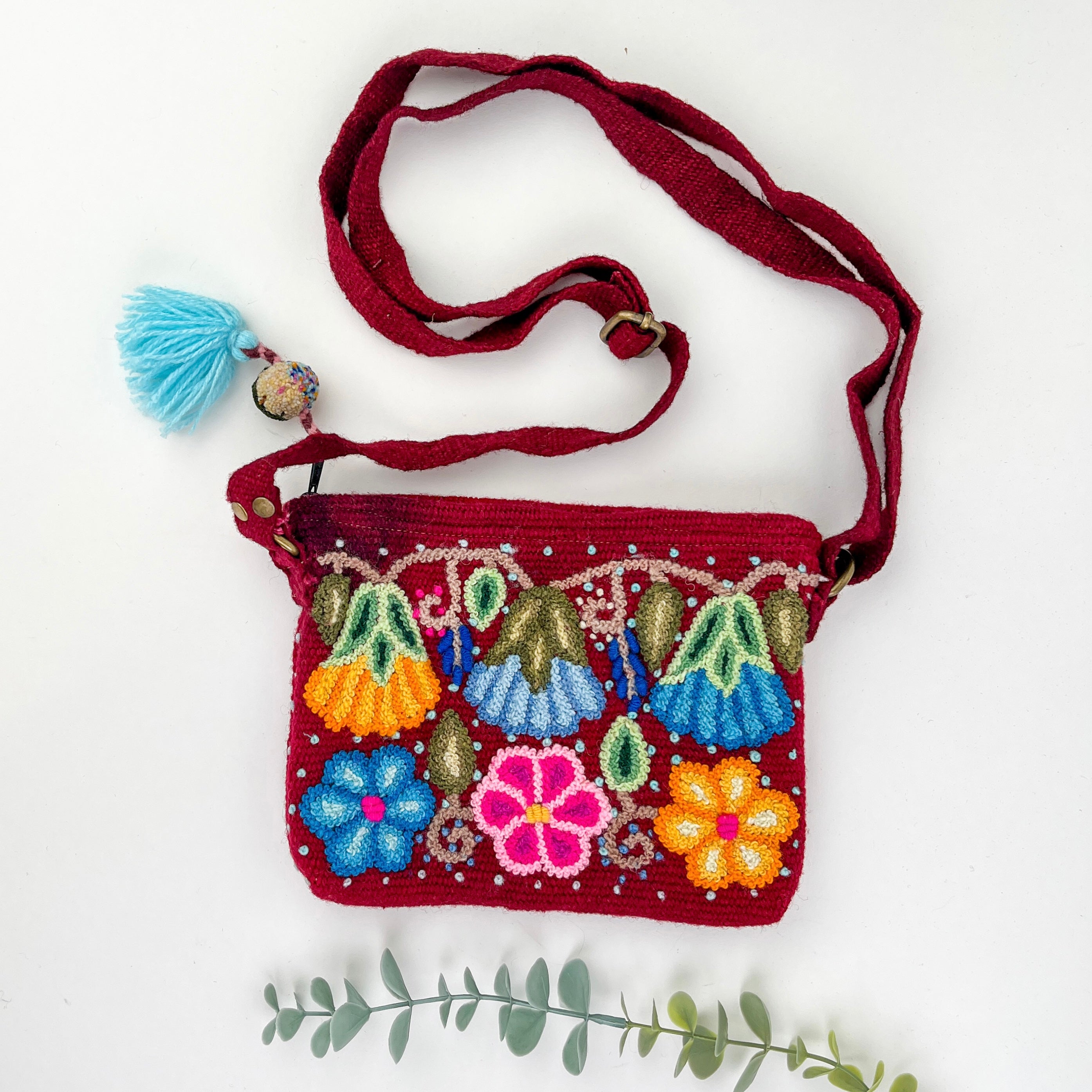Add personality to your wardrobe with this crossbody bag, featuring hand-embroidery unique designs. Includes cotton lining, top zipper, and adjustable strap made of loomed wool. Made with natural organic materials, it is washable.