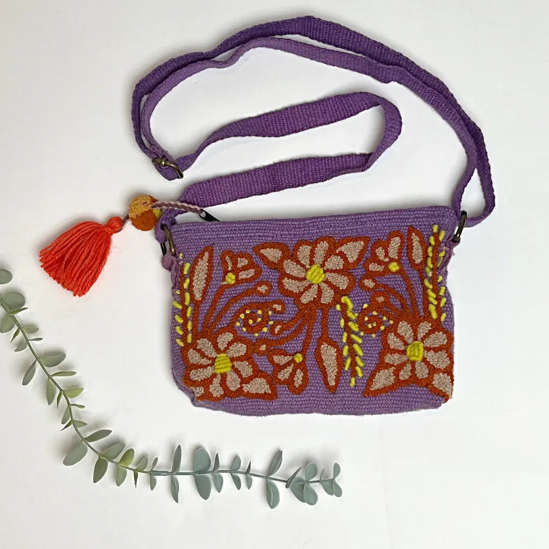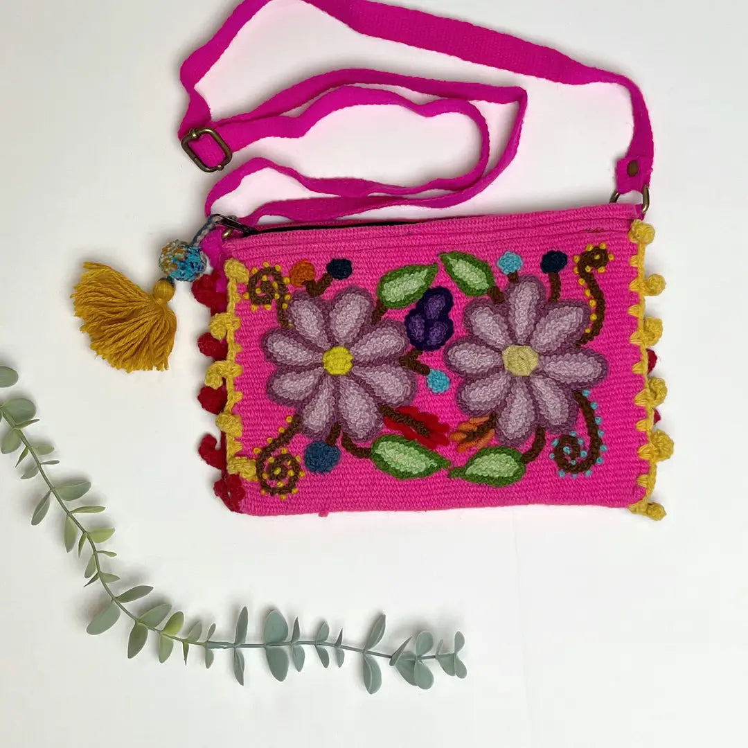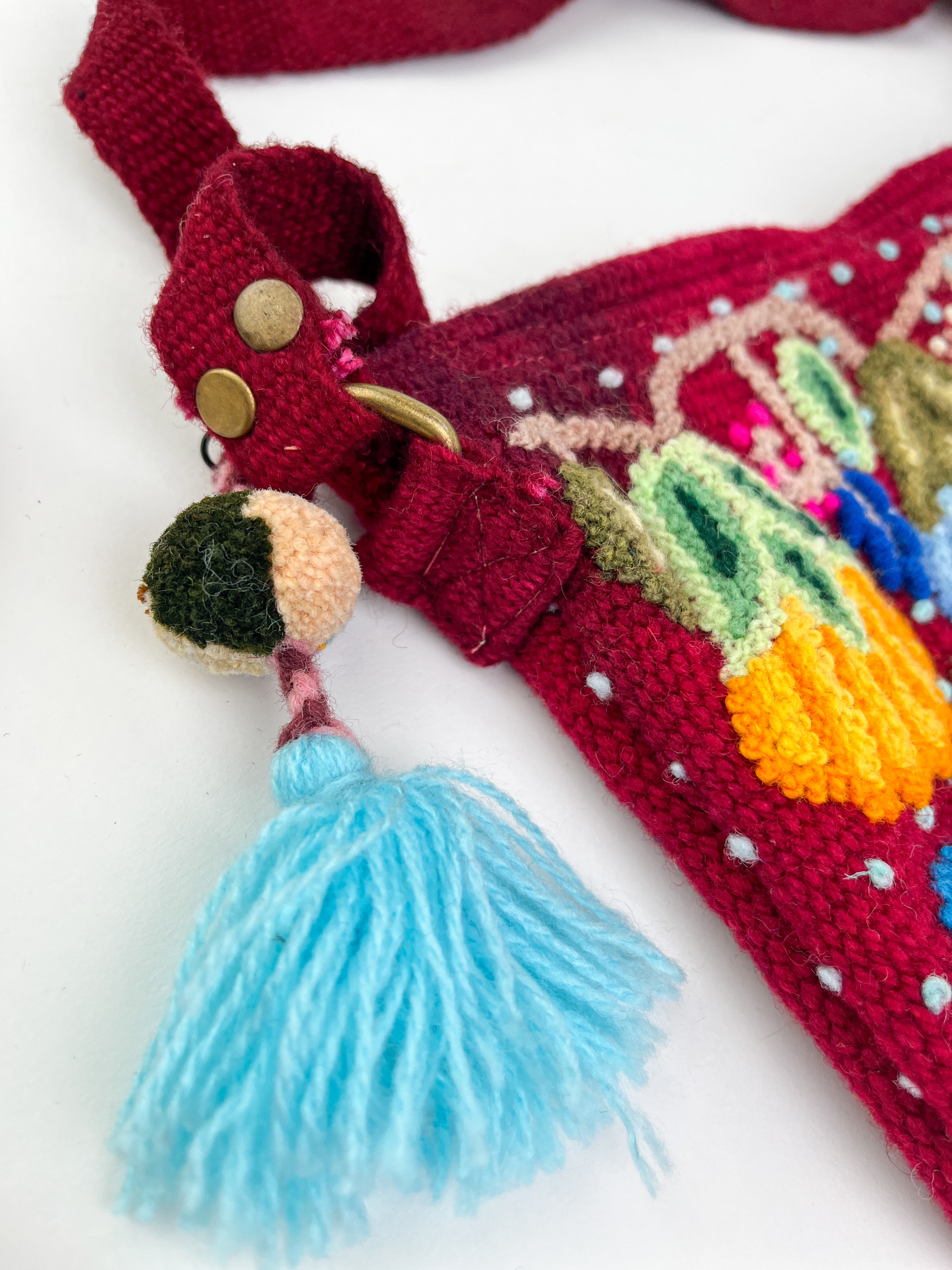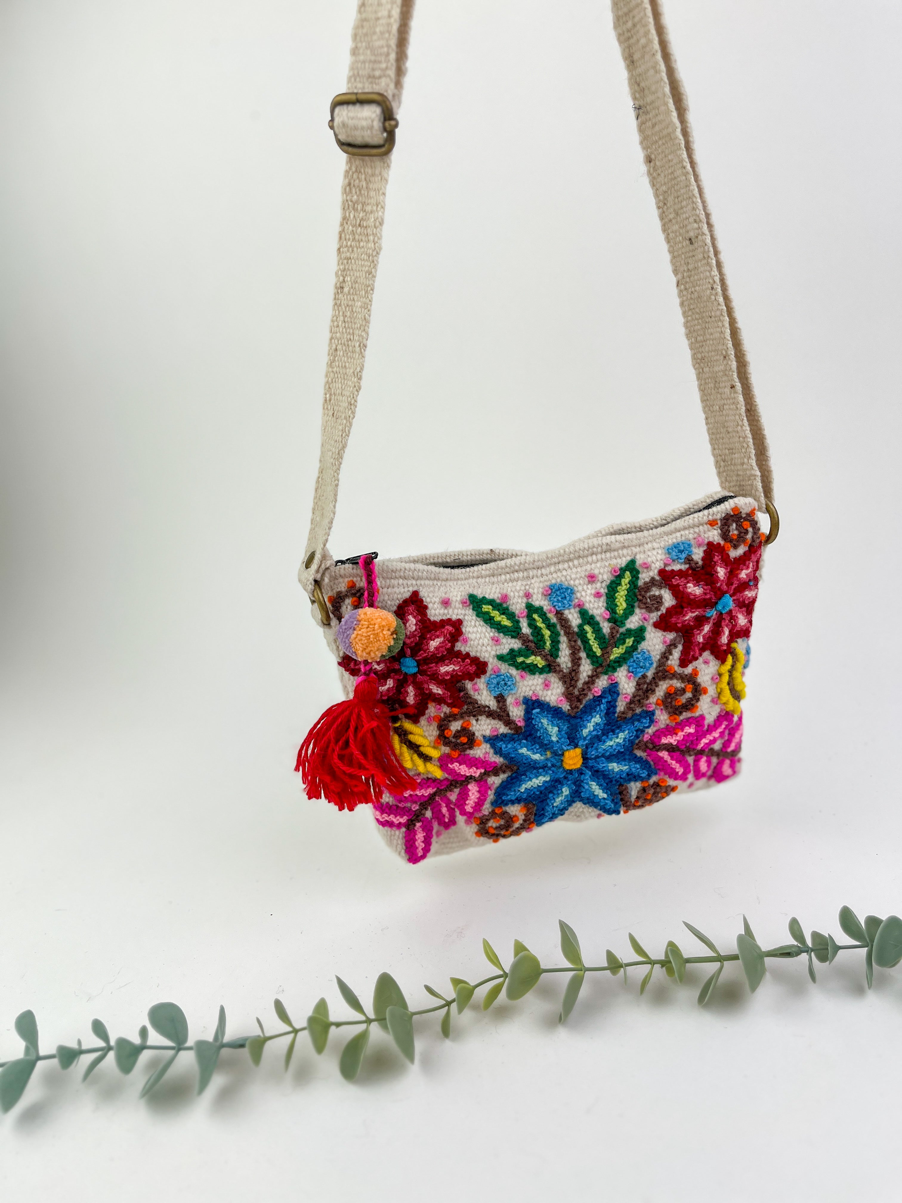 Add personality to your wardrobe with this crossbody bag, featuring hand-embroidery unique designs. Includes cotton lining, top zipper, and adjustable strap made of loomed wool. Made with natural organic materials, it is washable.