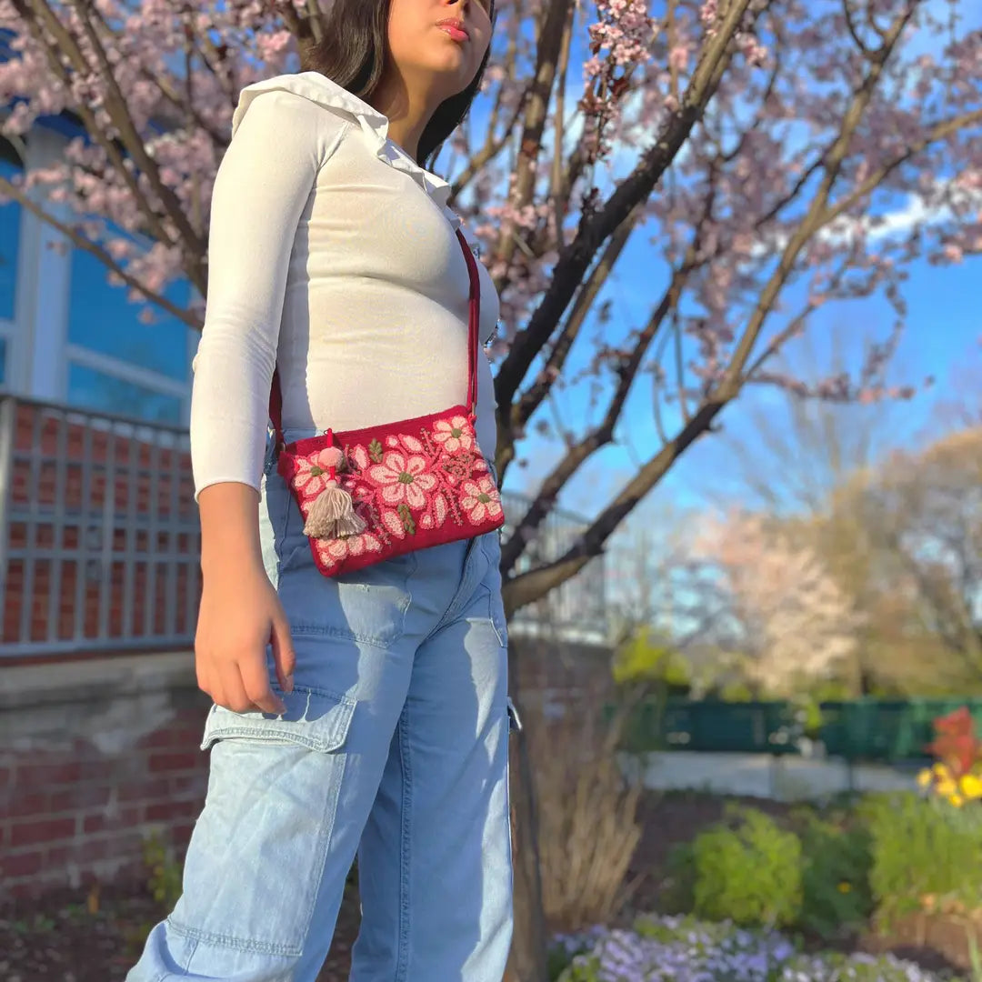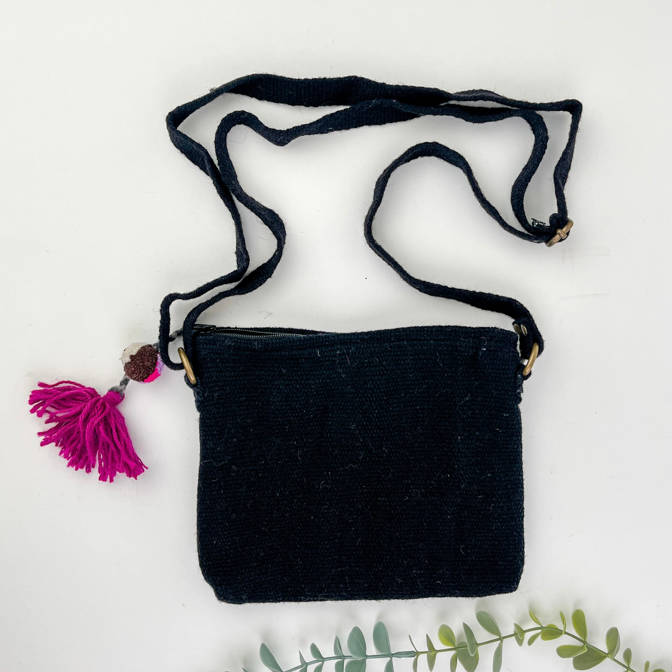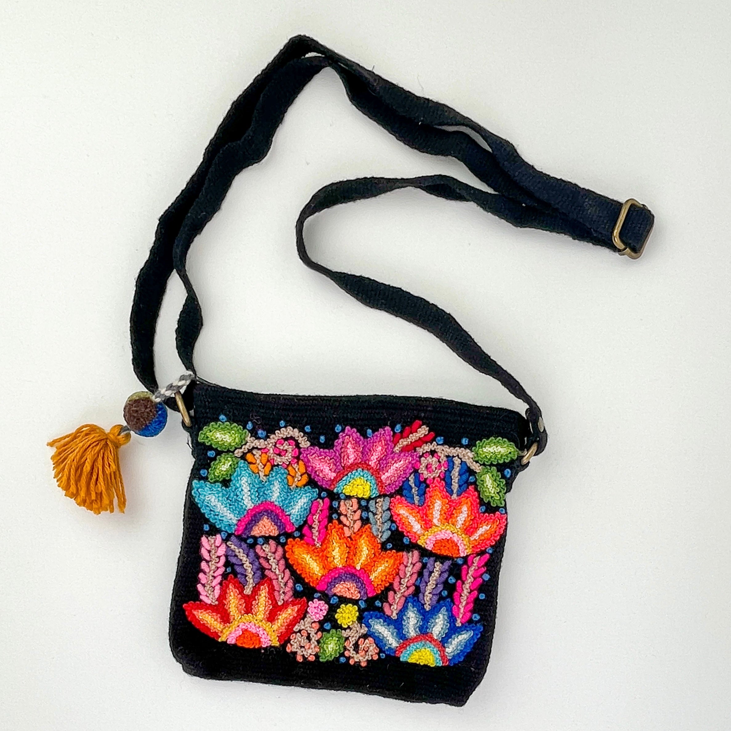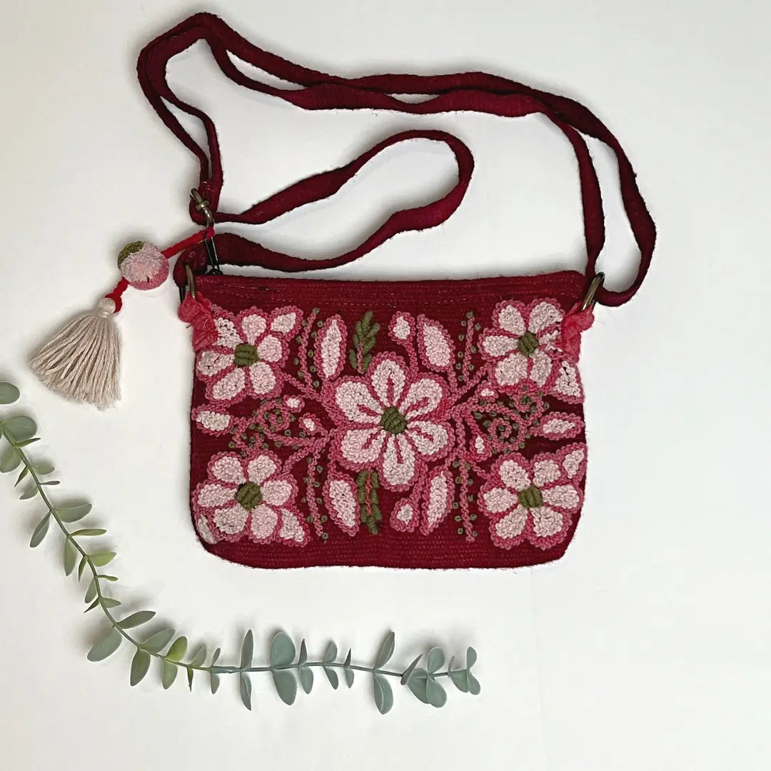 Add personality to your wardrobe with this crossbody bag, featuring hand-embroidery unique designs. Includes cotton lining, top zipper, and adjustable strap made of loomed wool. Made with natural organic materials, it is washable.