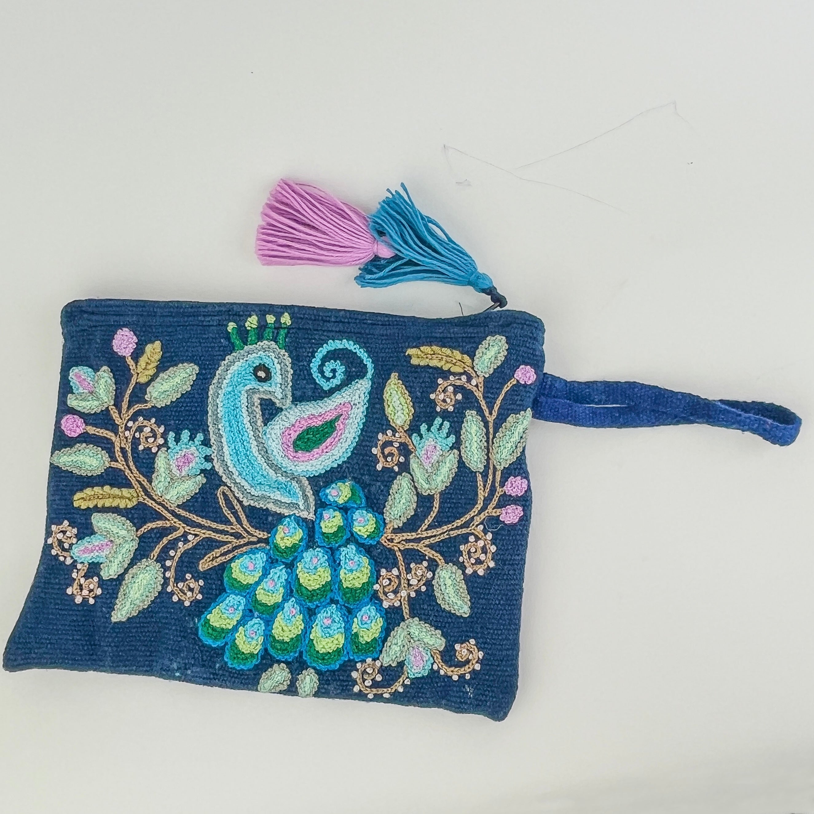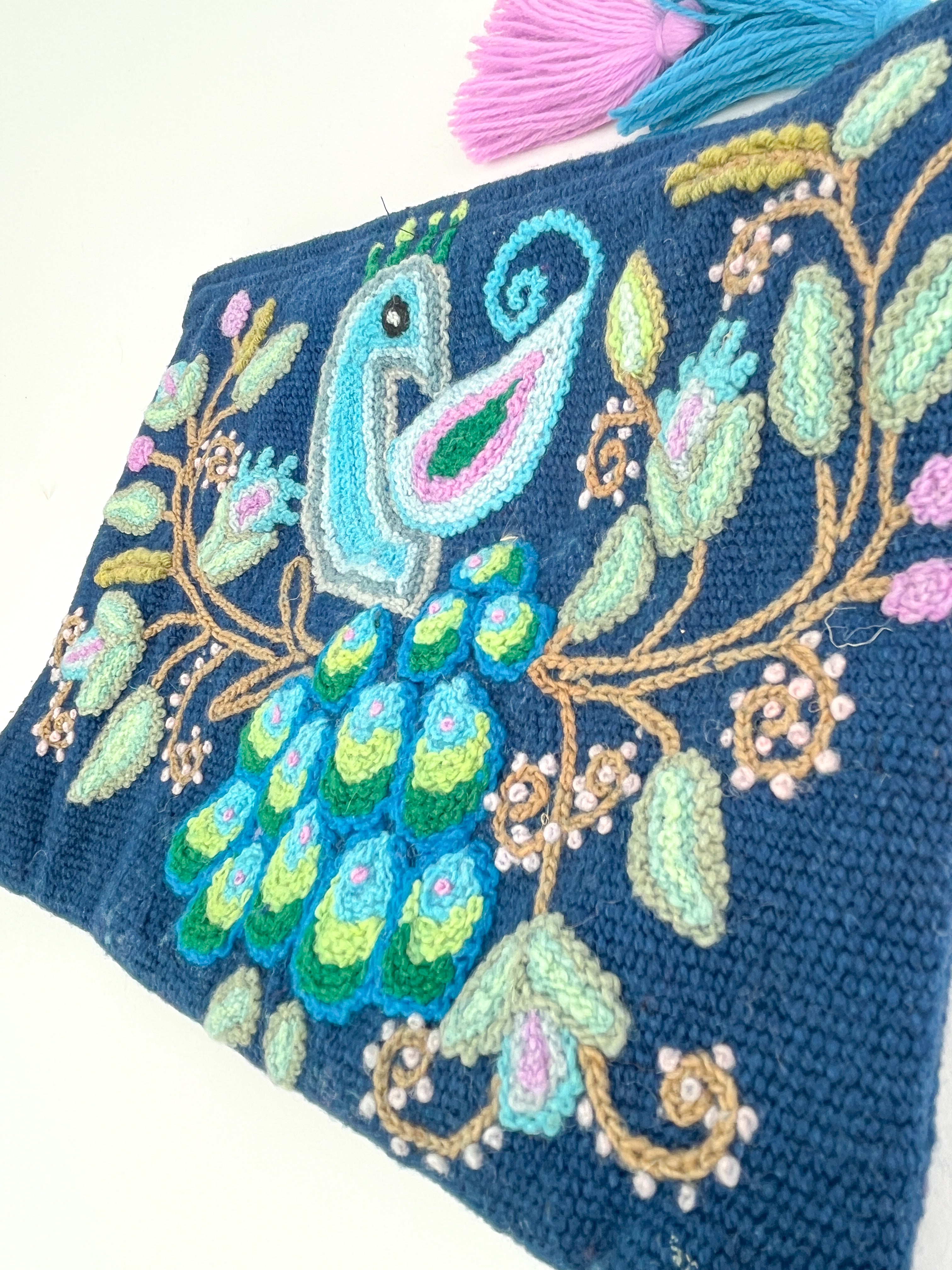 Crafted from soft wool in navy blue, this medium-sized pouch is fully lined and finished with a secure top zipper, playful tassels, and a comfortable wristlet for easy carrying. Whether you're storing a tablet, journal, or daily essentials, this pouch adds a touch of timeless charm to every moment.