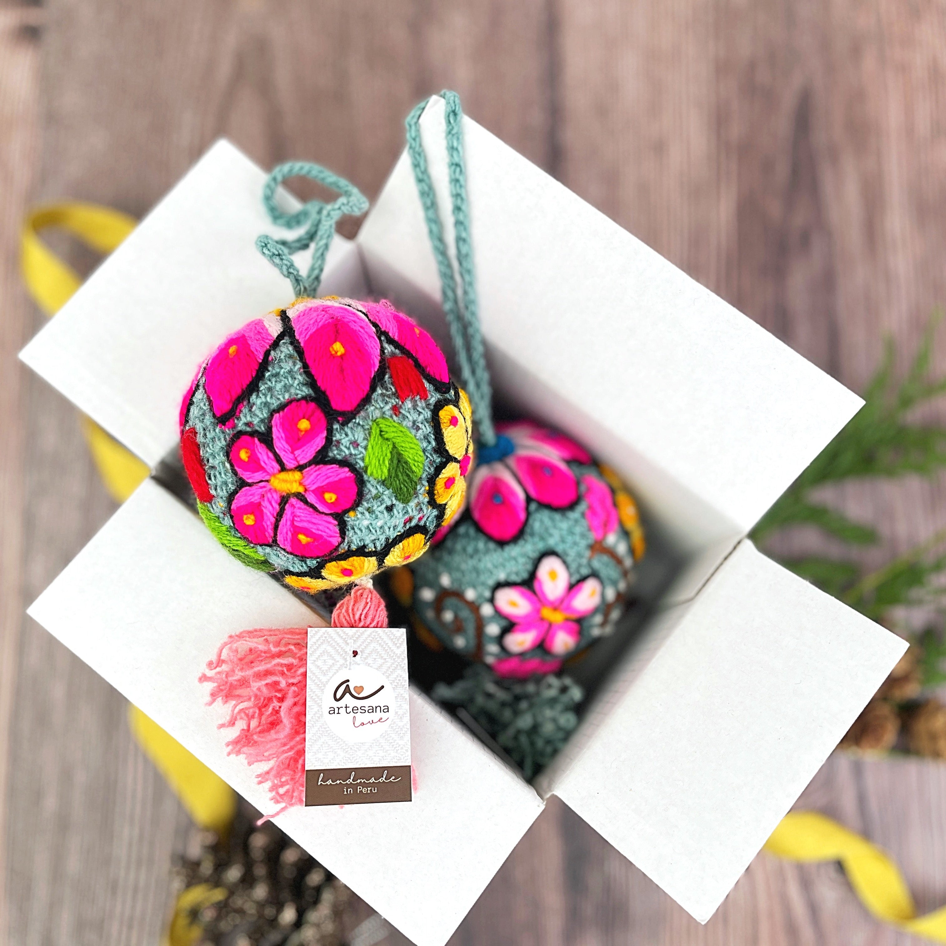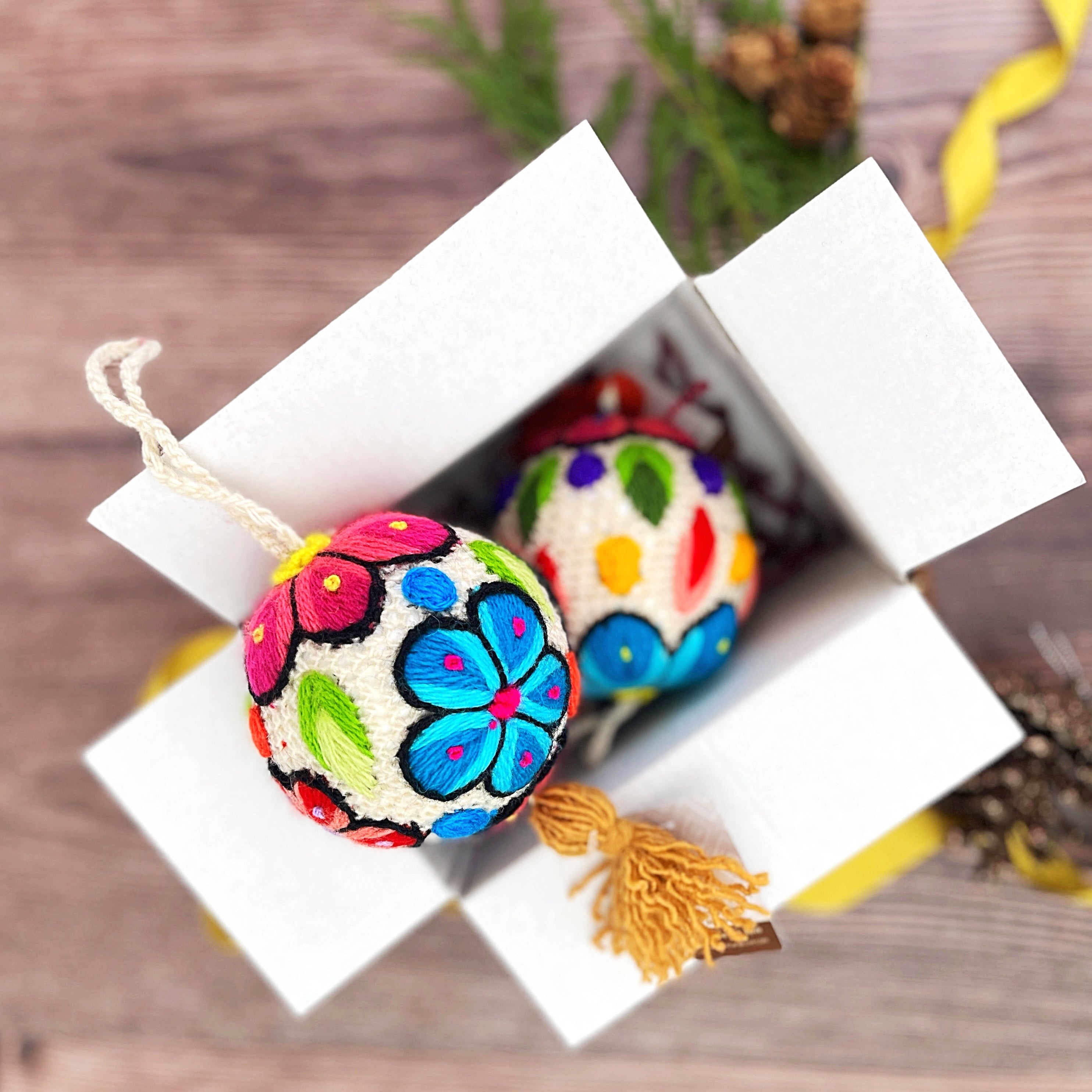 Hand embroidered Ball decoration with bright floral designs, and tassel. It features hand knitted sphere with delicate floral embroideries.