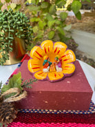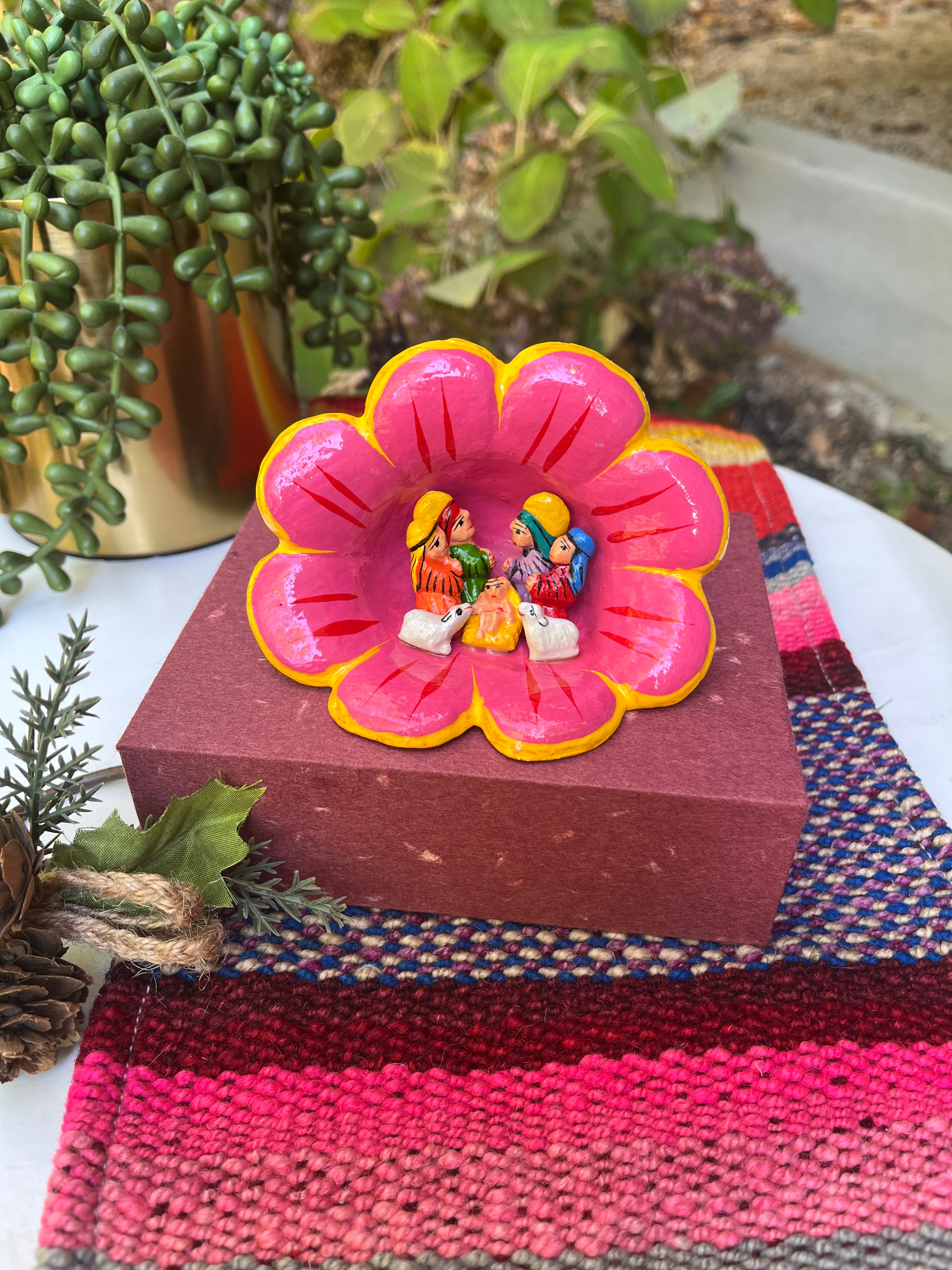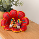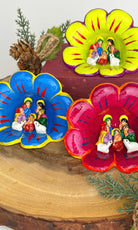 The most adorable Andean decoration for a special nook, mantel or Christmas Tree. Master artisans in Ayacucho work with local clay creating diminutive nativity scenes in ceramic, and hand painted. The Holy Family appears in Andean style flower setting, decorated with local style iconography.