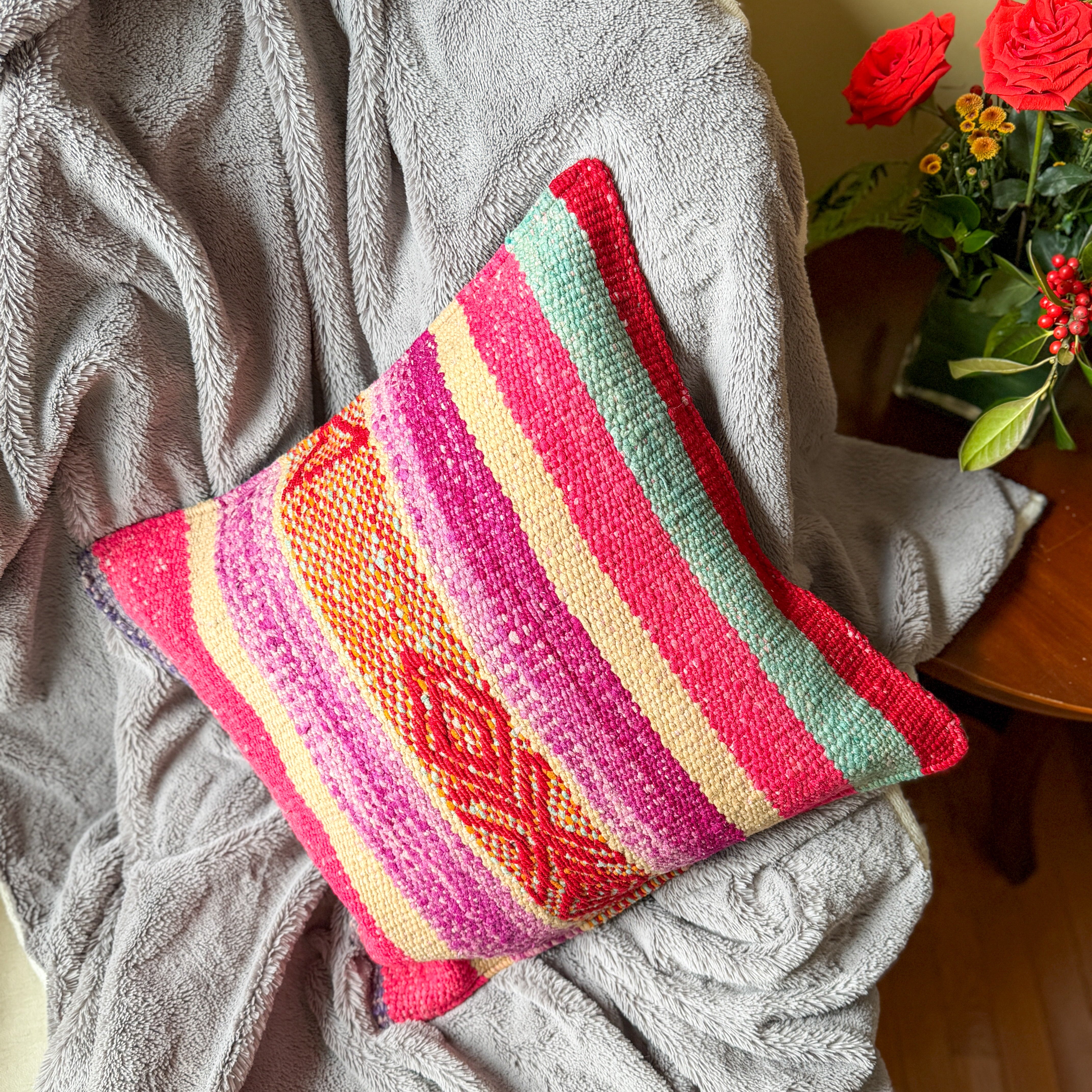 This eco-friendly pillow cover has been crafted from sheep’s wool spun on a drop spindle and naturally dyed with the bright natural colors of herbs, minerals, and insects, from the Andes. Each ArtesanaLove items have been carefully selected with our partner artisans and repurposed into this beautiful, one-of-a-kind pillow.