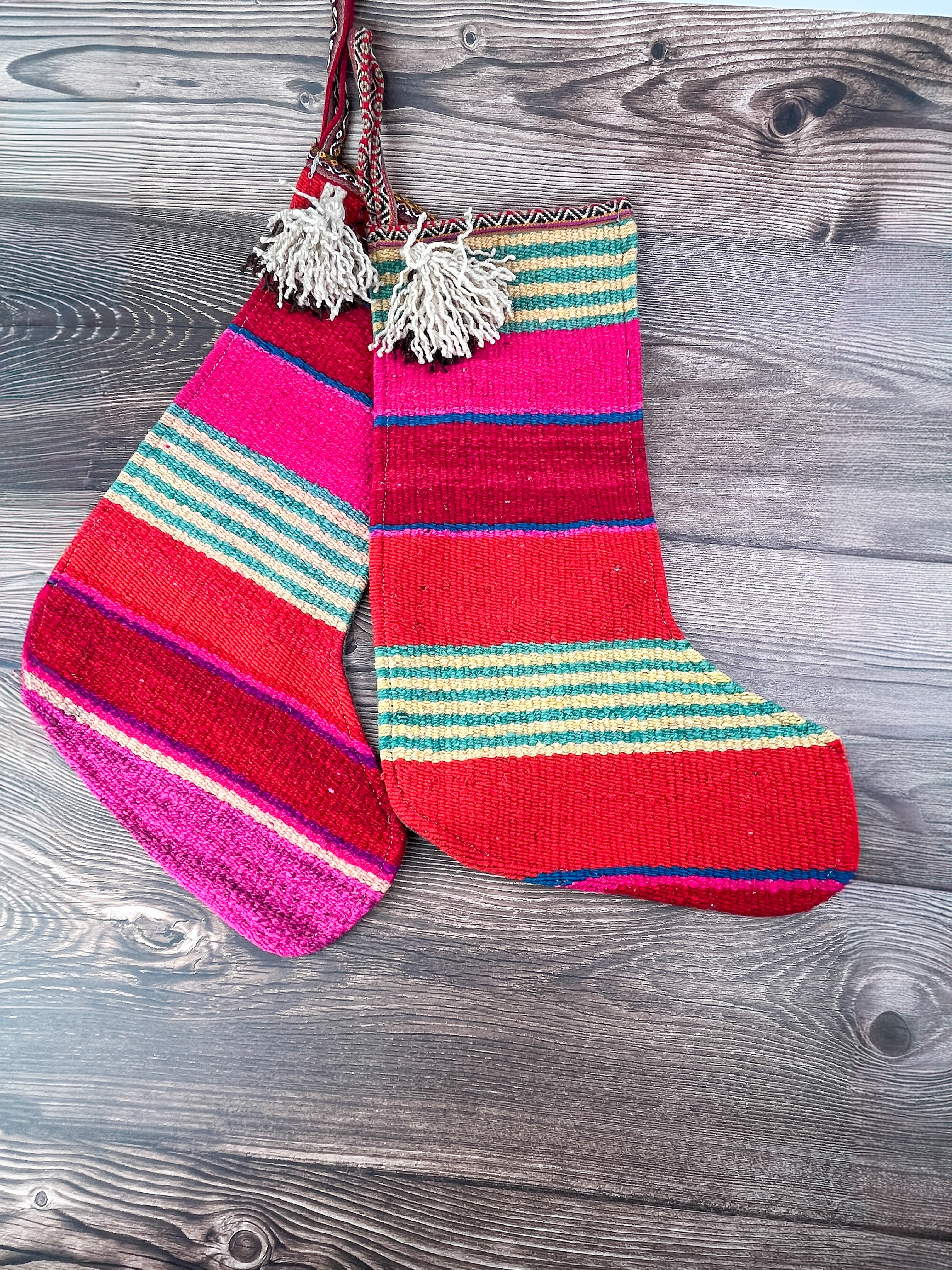 Add stunning texture to your holidays with our Vintage Textile Stocking. Each bootie is crafted from one-of a kind vibrant, vintage hand loomed 'frazada' or blanket, and decorated with traditional Andean ribbon at the top border, and added a loop for hanging. Our Andino stocking features two hand made pom poms at the top side to add a touch of playfulness to your boho, chic holiday decor!