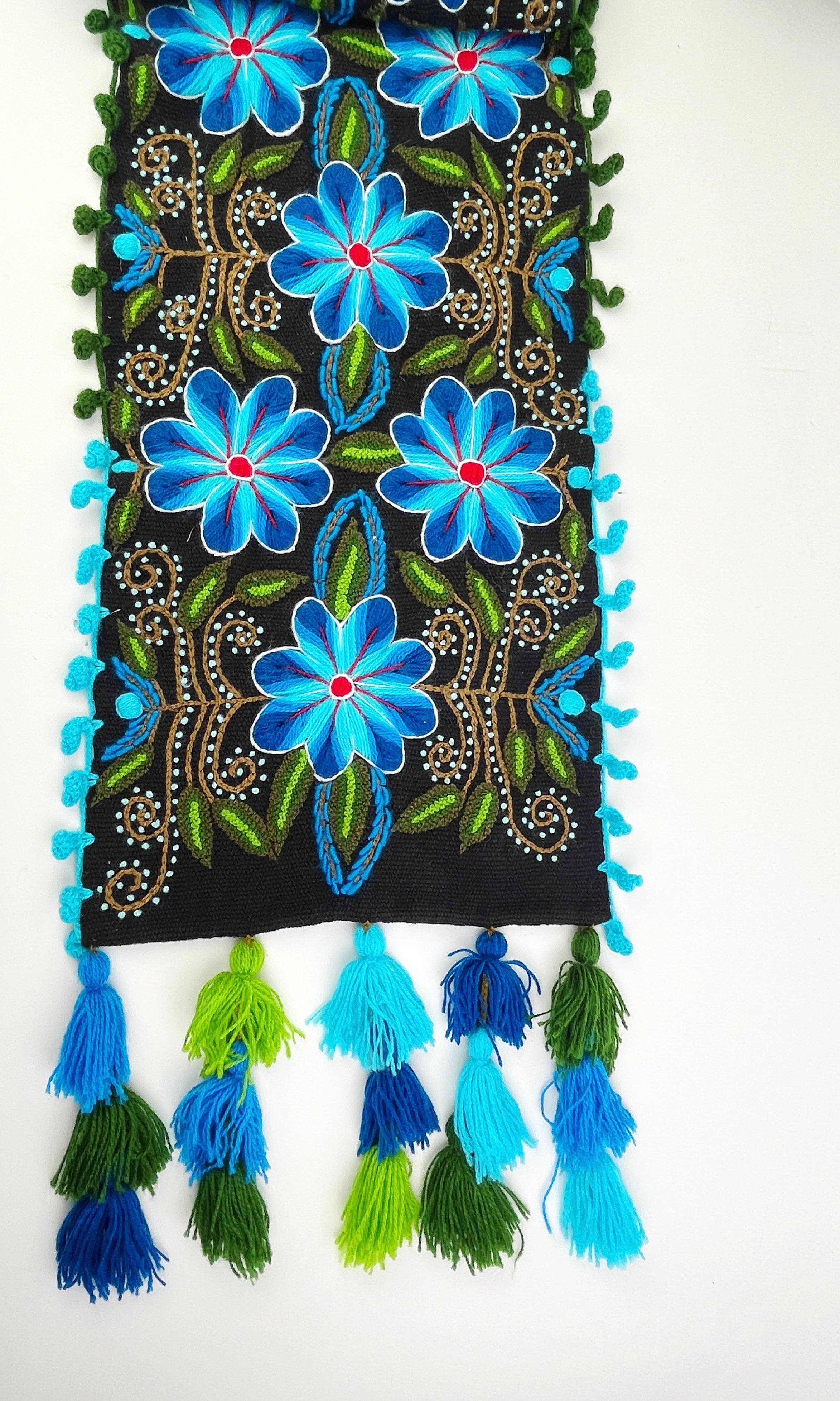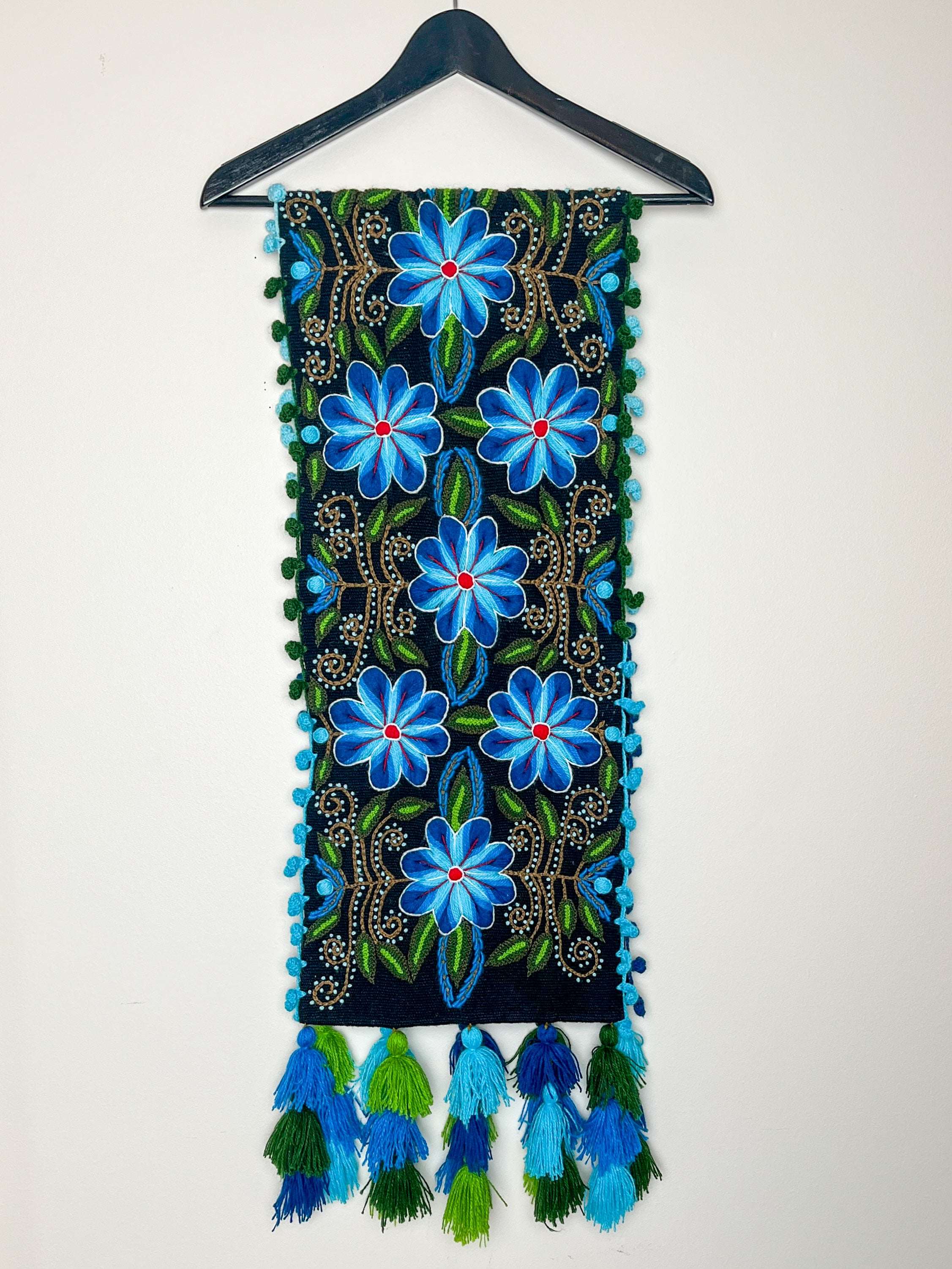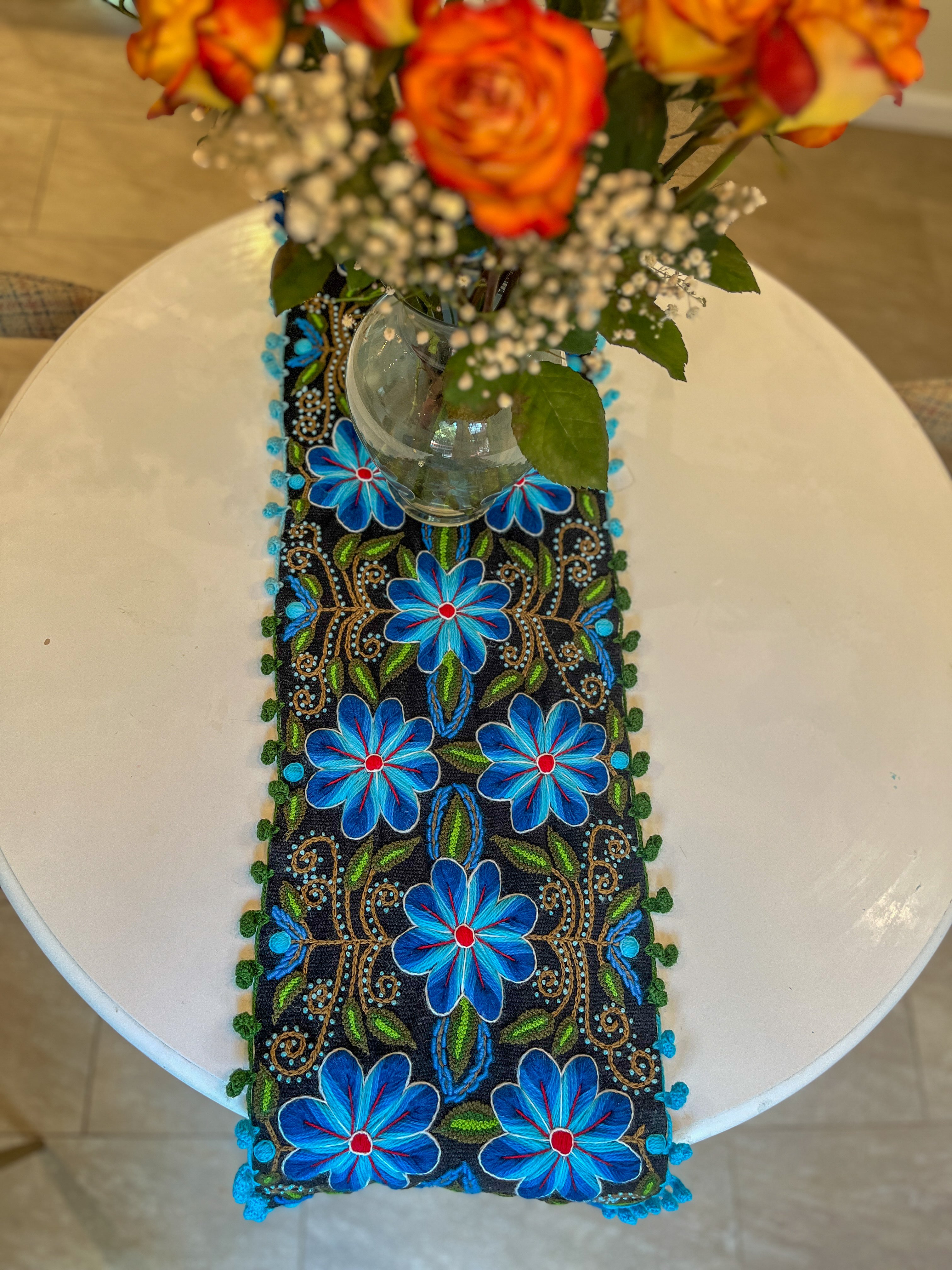 Whether you're hosting a dinner or just sipping your morning coffee, this vibrant piece brings warmth, meaning, and color into your home. Hand embroidered with a unique floral design, this runner is one-of-a-kind. Use it on your dining table, foyer, or as a bed foot to add a smile to your day!