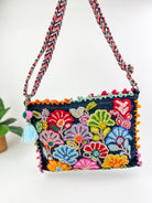 From the hand-loomed wool and alpaca fabric to the joyful florals hand-embroidered in radiant hues, this bag is more than an accessory—it’s wearable art. The adjustable loomed strap and playful pom poms add extra flair, while the fully lined interior keeps things practical with a secure zip pocket.