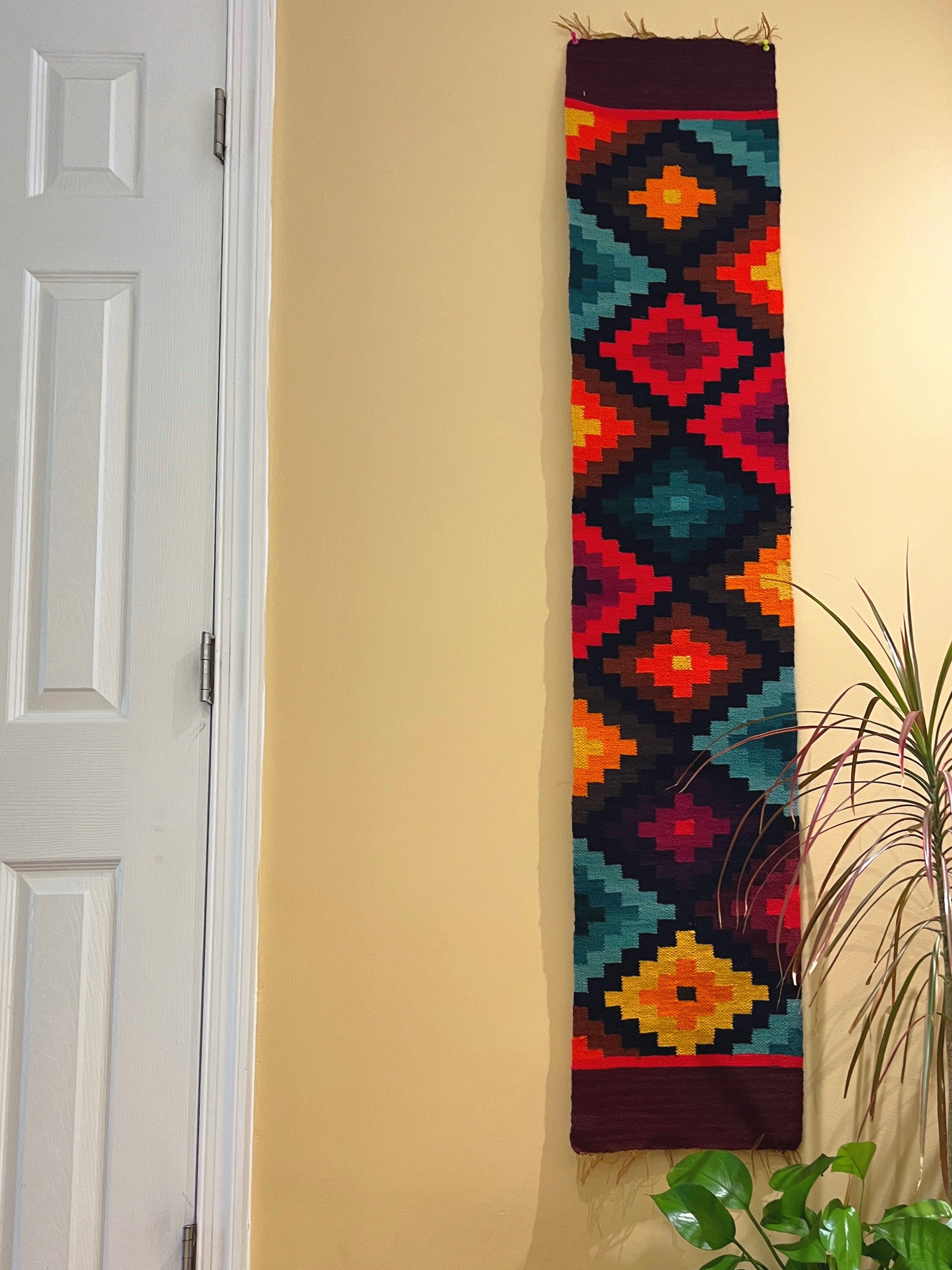 Brighten your day with this vibrant and unique runner. Our Chacana runner is crafted with 100% sheep wool using artisanal techniques, by skilled artisans in Peru. The piece is full of Quechua heritage with a unique geometric design, know as the 'chacana" or Andean Cross. This textile is just interesting one-of-a-kind piece that can be used it on your dining table, foyer or hanged as a tapestry in your home or office!