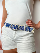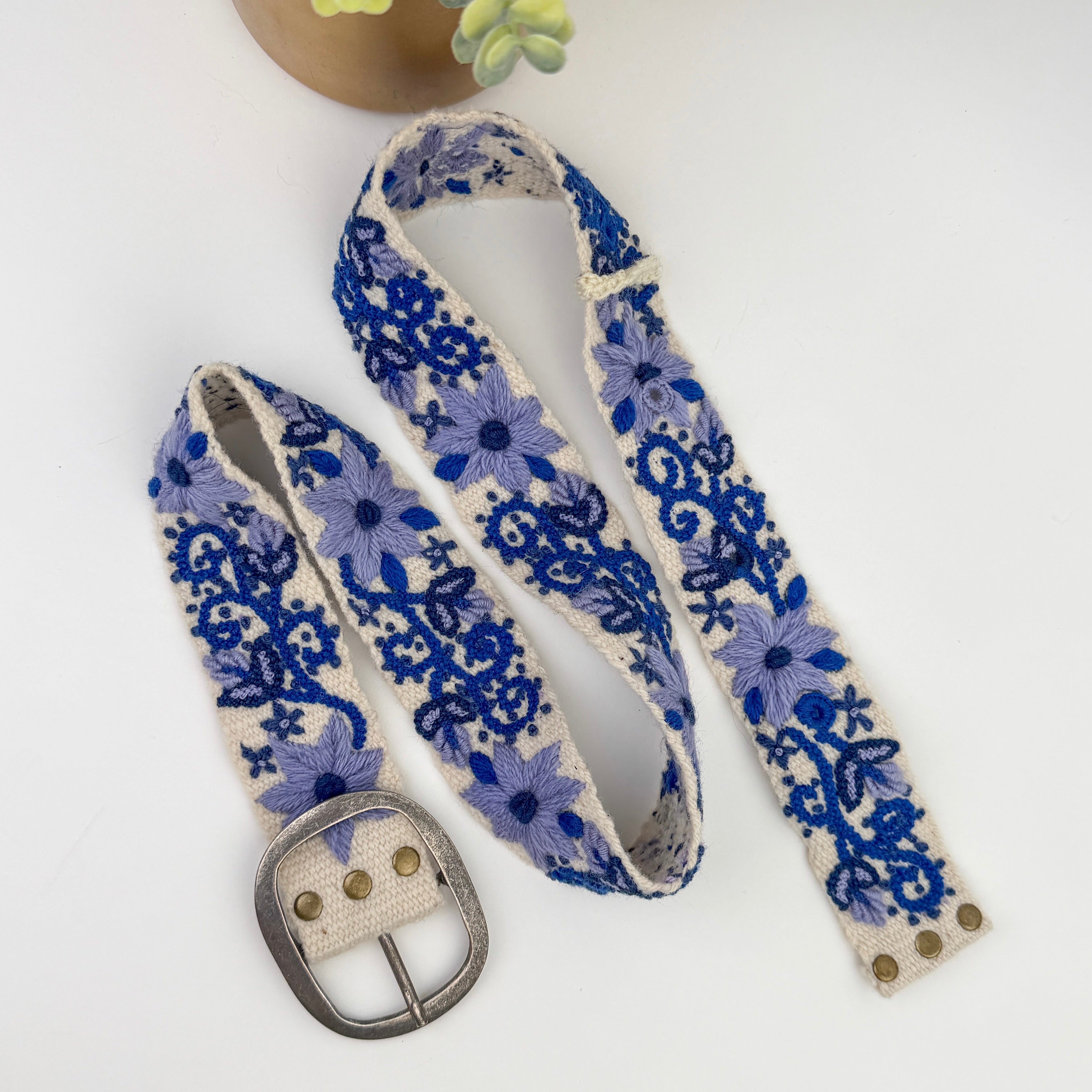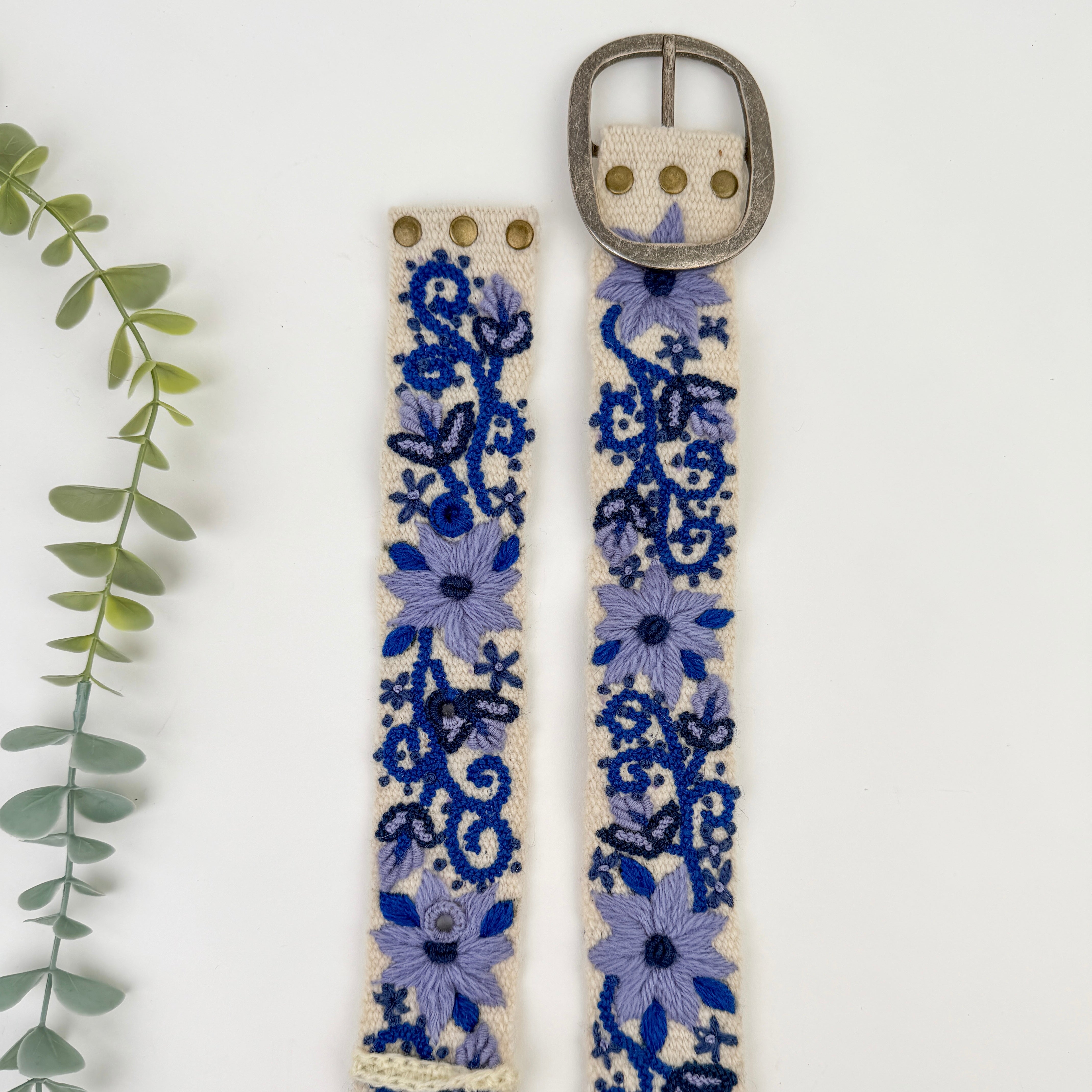 Handcrafted in Peru from soft wool and finished with delicate hand embroidery, this belt brings cobalt-blue vines and florals to life against a crisp white background. Slip it through linen trousers and suddenly your look is polished. Cinch it over a summer dress and it becomes romantic. Add it to denim and a white shirt and it transforms the everyday into something quietly special. Light, versatile, and endlessly wearable, Atelier Azul moves effortlessly from day to evening, casual to refined.
